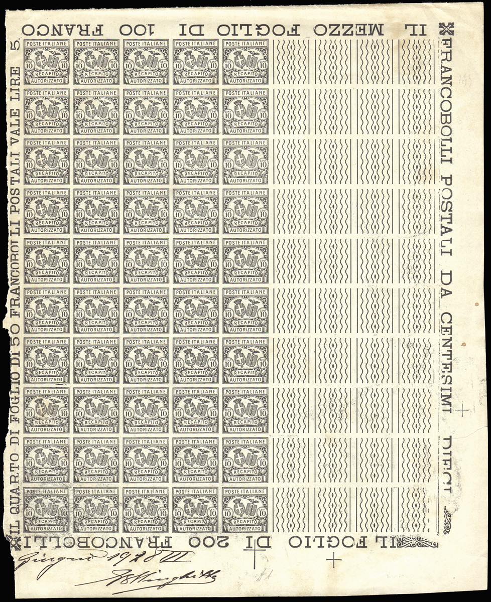 1928 - 10 cent., prova di macchina in nero (1), quarto di foglio completo di 50 esemplari, non dentellato, senza gomma come sempre, ottimo stato. Molto raro! A. Diena.