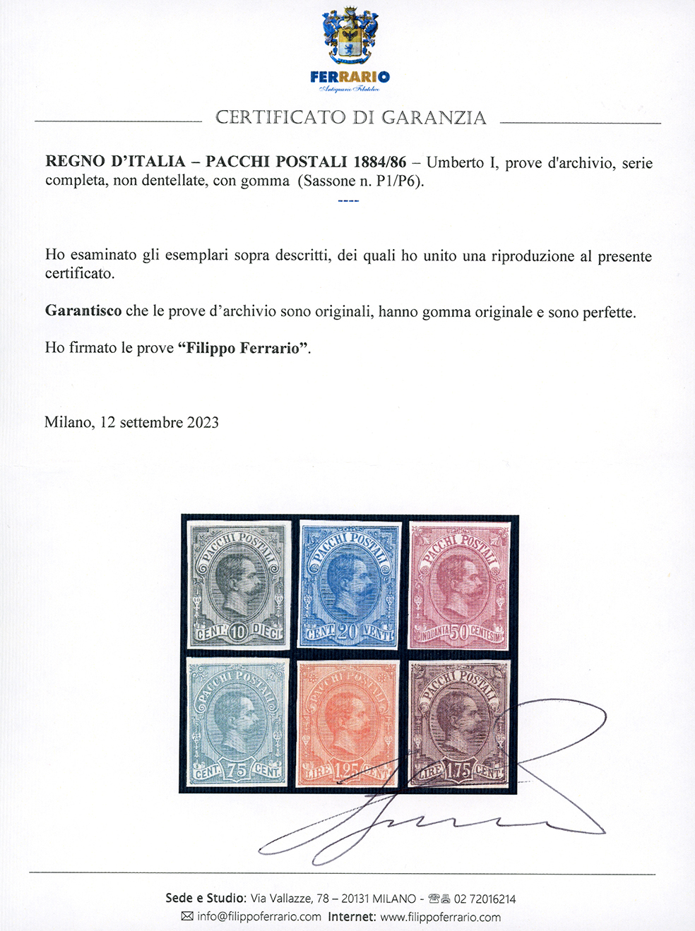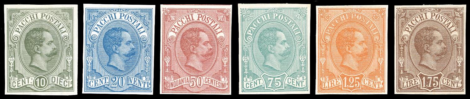 1884/86 - Umberto I, prove d'archivio, non dentellate, serie completa (P1/P6), gomma originale, perfette e molto fresche. Rare. Cert. Ferrario.