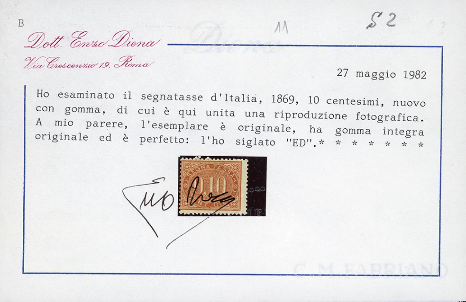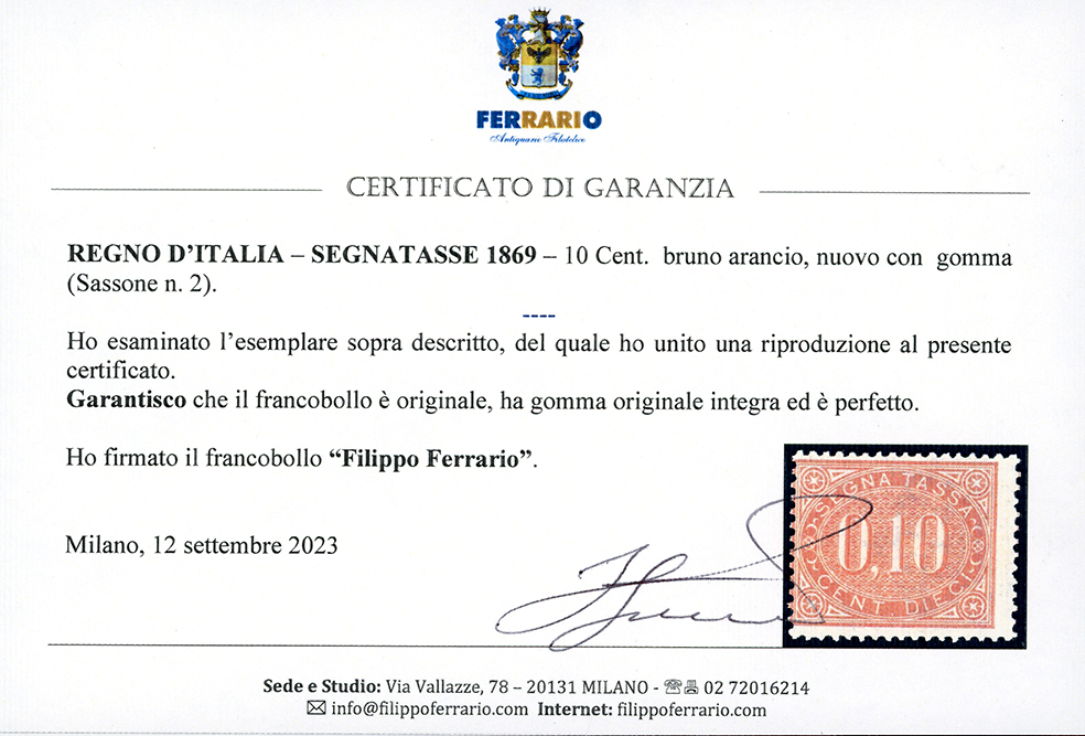 1869 - 10 cent. bruno arancio (2), gomma originale integra, perfetto. Em.Diena, cert. E.Diena e Ferrario.