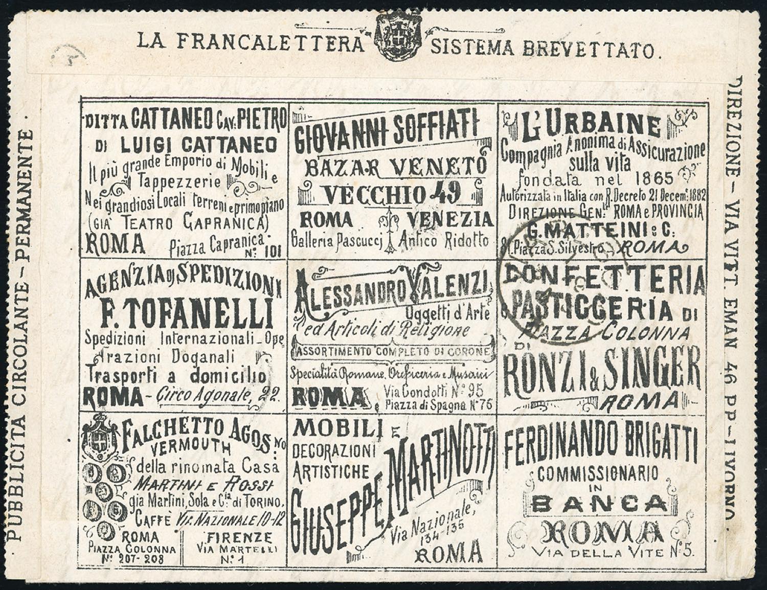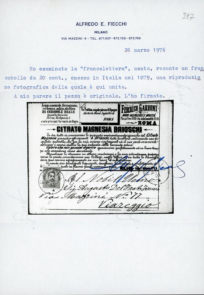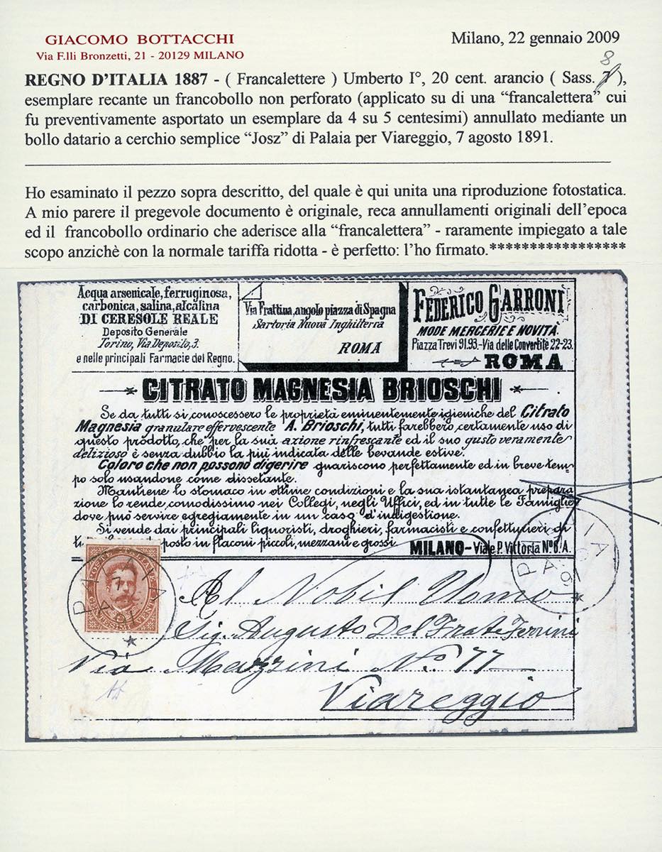 1891 - 20 cent. Umberto I, non perforato (8), perfetto, usato su Francalettera da Palaia 7/8/1891 a Viareggio. Raro uso di francobollo ... Read more