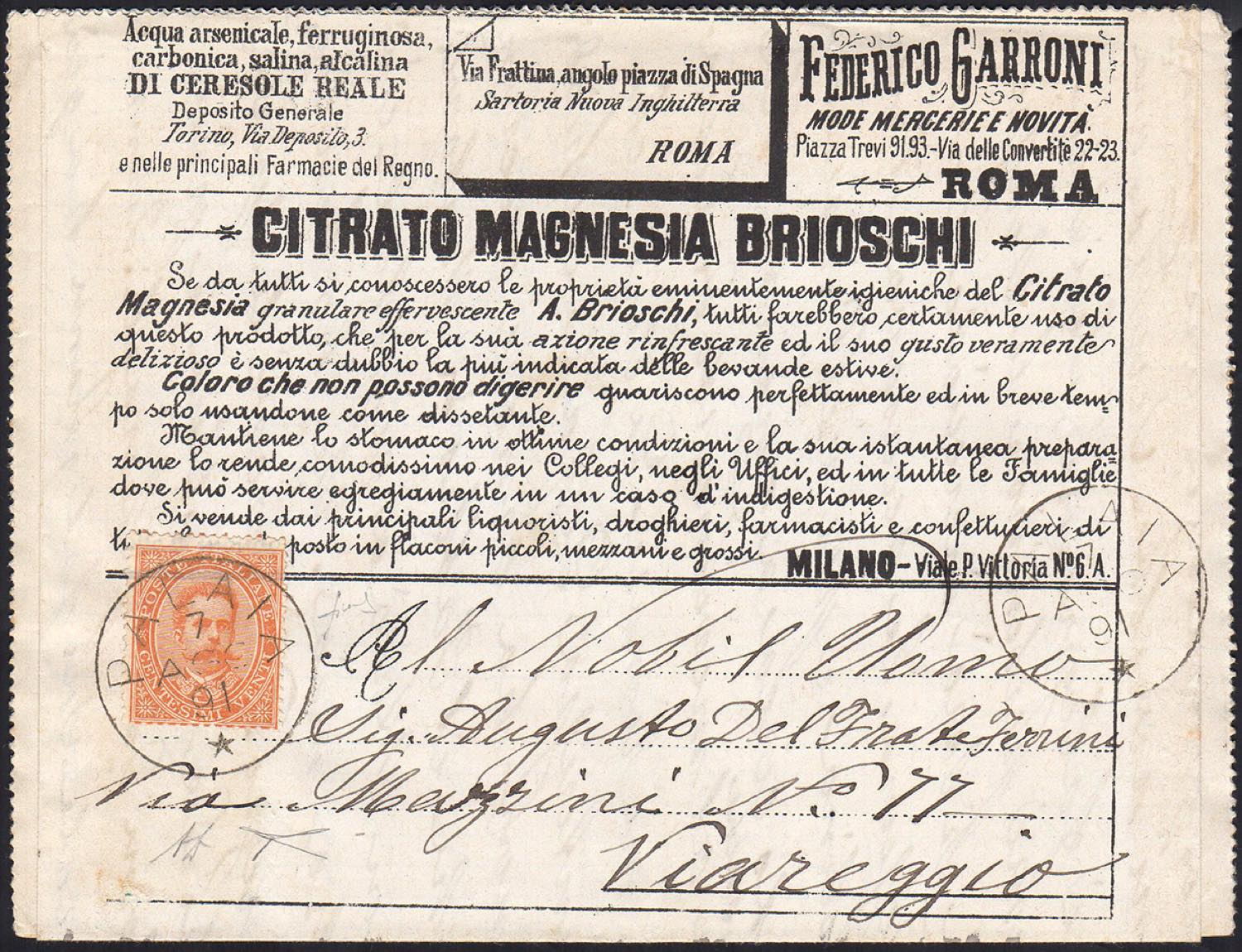 1891 - 20 cent. Umberto I, non perforato (8), perfetto, usato su Francalettera da Palaia 7/8/1891 a Viareggio. Raro uso di francobollo ordinario! Cert. Diena, Bottacchi, Fiecchi.