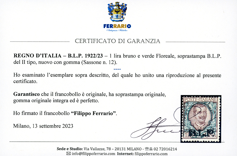 1922/23 - 1 lira Floreale, soprastampa BLP del II tipo (12), nuovo, gomma originale integra, perfetto. Fresco. A.Diena, cert. Ferrario.