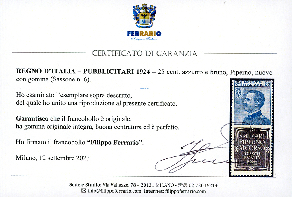 1924 - 25 cent. Piperno (6), nuovo, gomma originale integra, perfetto. Molto fresco, buona centratura. A.Diena, Fiecchi, Sirotti, cert. Ferrario.