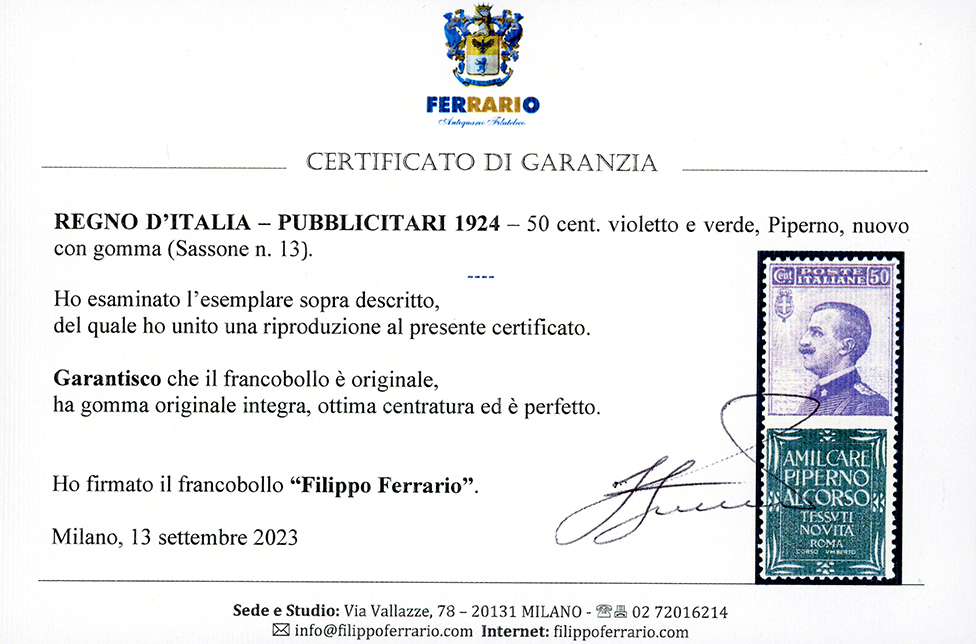 1924 - 50 cent. Piperno (13), nuovo, gomma originale integra, perfetto. Molto fresco ed ottimamente centrato. Splendido! Sirotti, cert. Ferrario.