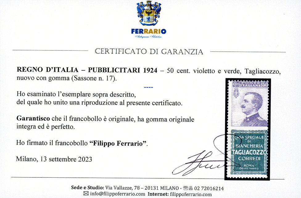 1924 - 50 cent. Tagliacozzo (17), gomma originale integra, perfetto. Molto fresco. Cert. Diena e Ferrario.