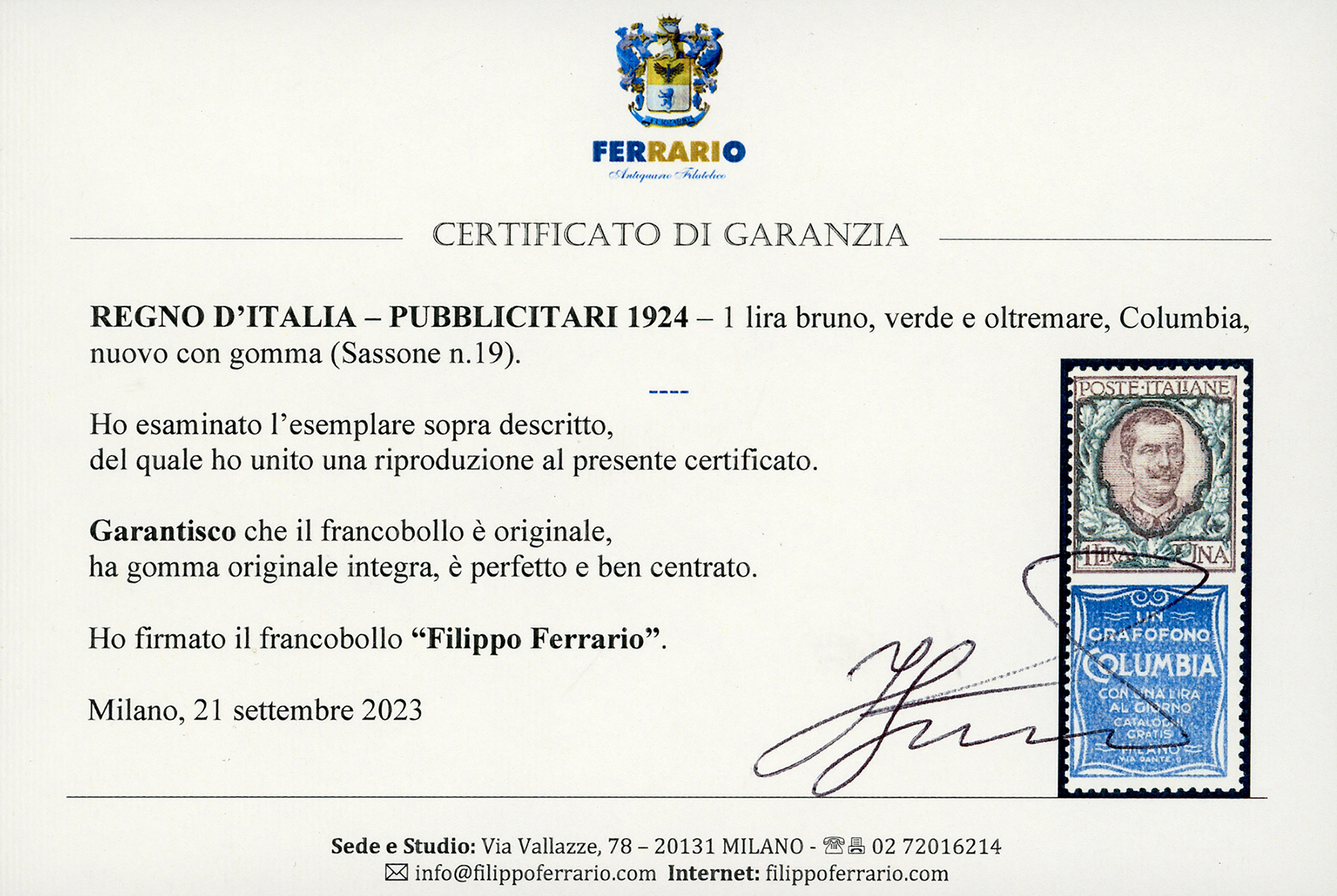 1924 - 1 lira Columbia (19), nuovo, gomma originale integra, perfetto. Molto fresco e ben centrato. A.Diena, cert. Ferrario.