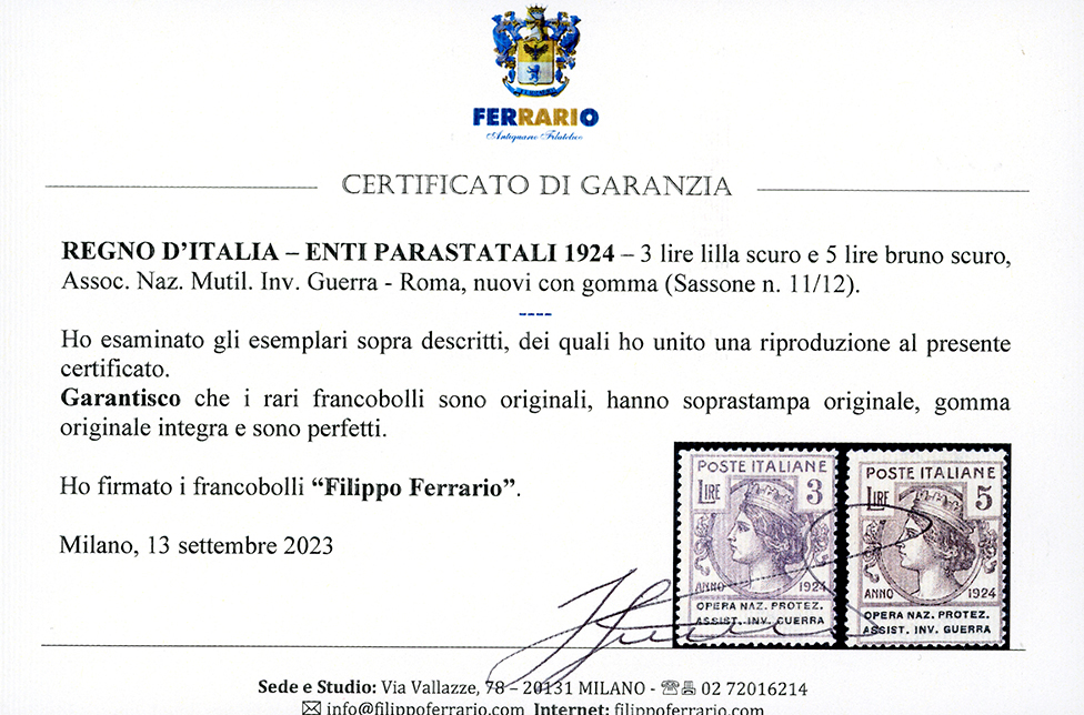 OPERA NAZ.PROTEZ.ASSIST.INV.GUERRA-ROMA 1924 - Serie completa (50/57), gomma originale integra, perfetti. Rara e di ottima qualità. A.Diena, Chiavarello, cert. Raybaudi e Ferrario per i due alti valori.