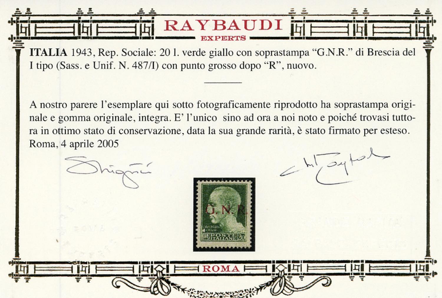 1943 - 20 lire soprastampa G.N.R. di Brescia, I tipo, punto grosso dopo la R (487/Ipc), gomma originale integra, perfetto. UNICO ESEMPLARE NOTO, rarità assoluta del settore. Cert. Oro Raybaudi.