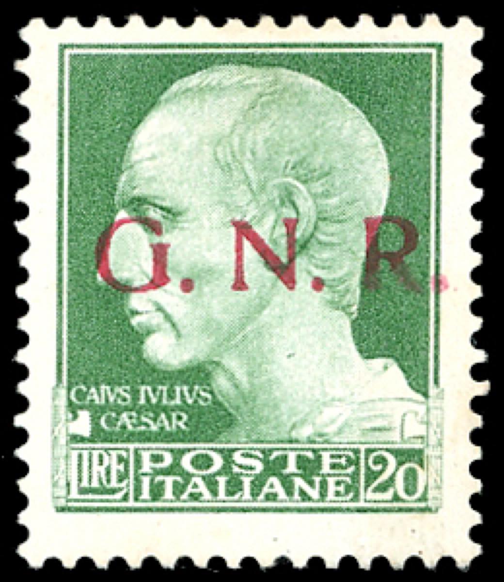 1943 - 20 lire soprastampa G.N.R. di Brescia, I tipo, punto grosso dopo la R (487/Ipc), gomma originale integra, perfetto. UNICO ESEMPLARE ... Read more