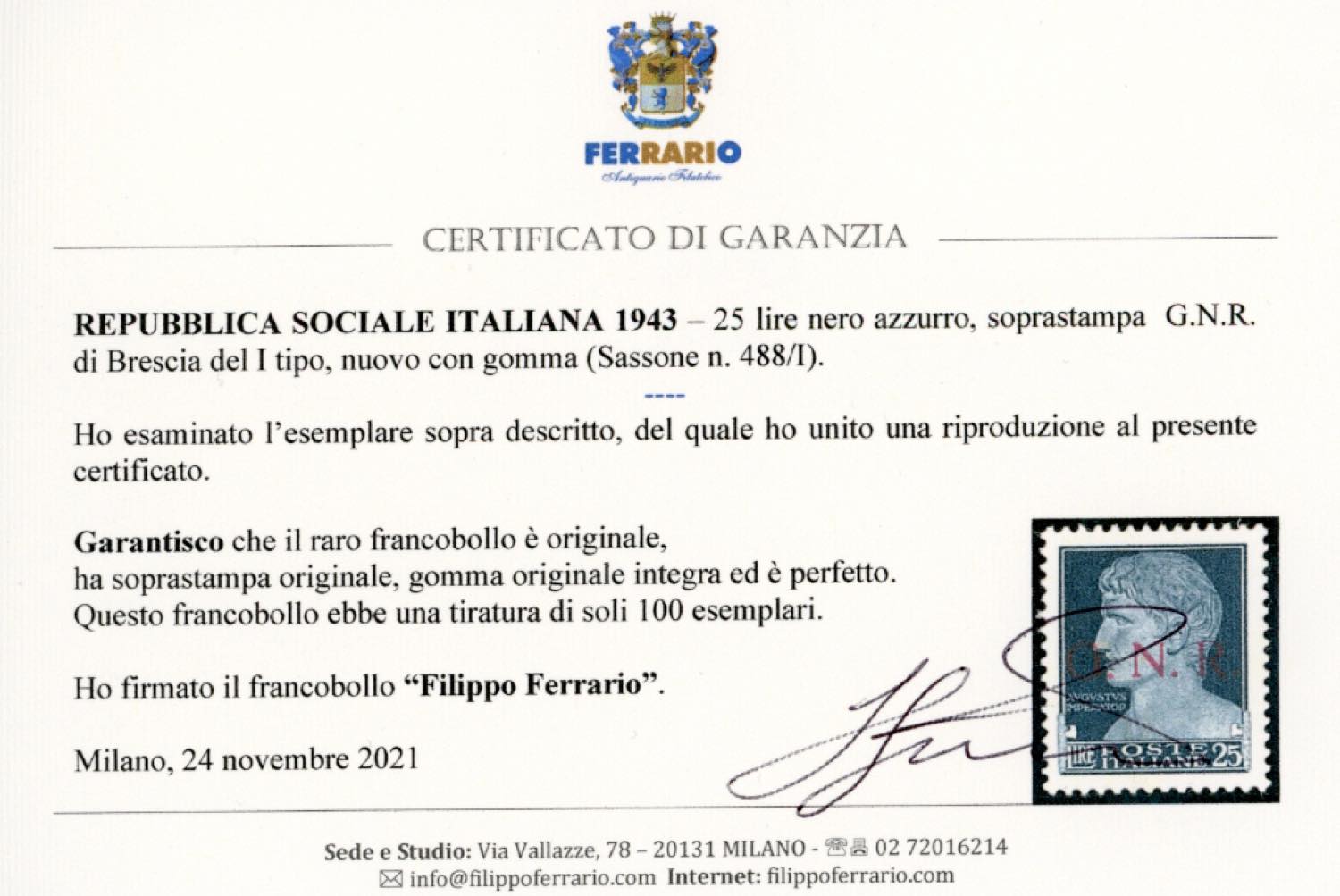 1943 - 25 lire nero azzurro, soprastampa G.N.R. di Brescia del I tipo (488/I), nuovo, gomma originale integra, perfetto. Molto fresco e raro, tiratura 100 esemplari. Cert. Ferrario.