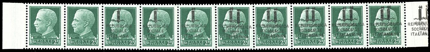 1944 - 25 cent. striscia orizzontale di 10, i primi due esemplari senza soprastampa, il terzo, il quarto ed il quinto soprastampati, i ... Read more