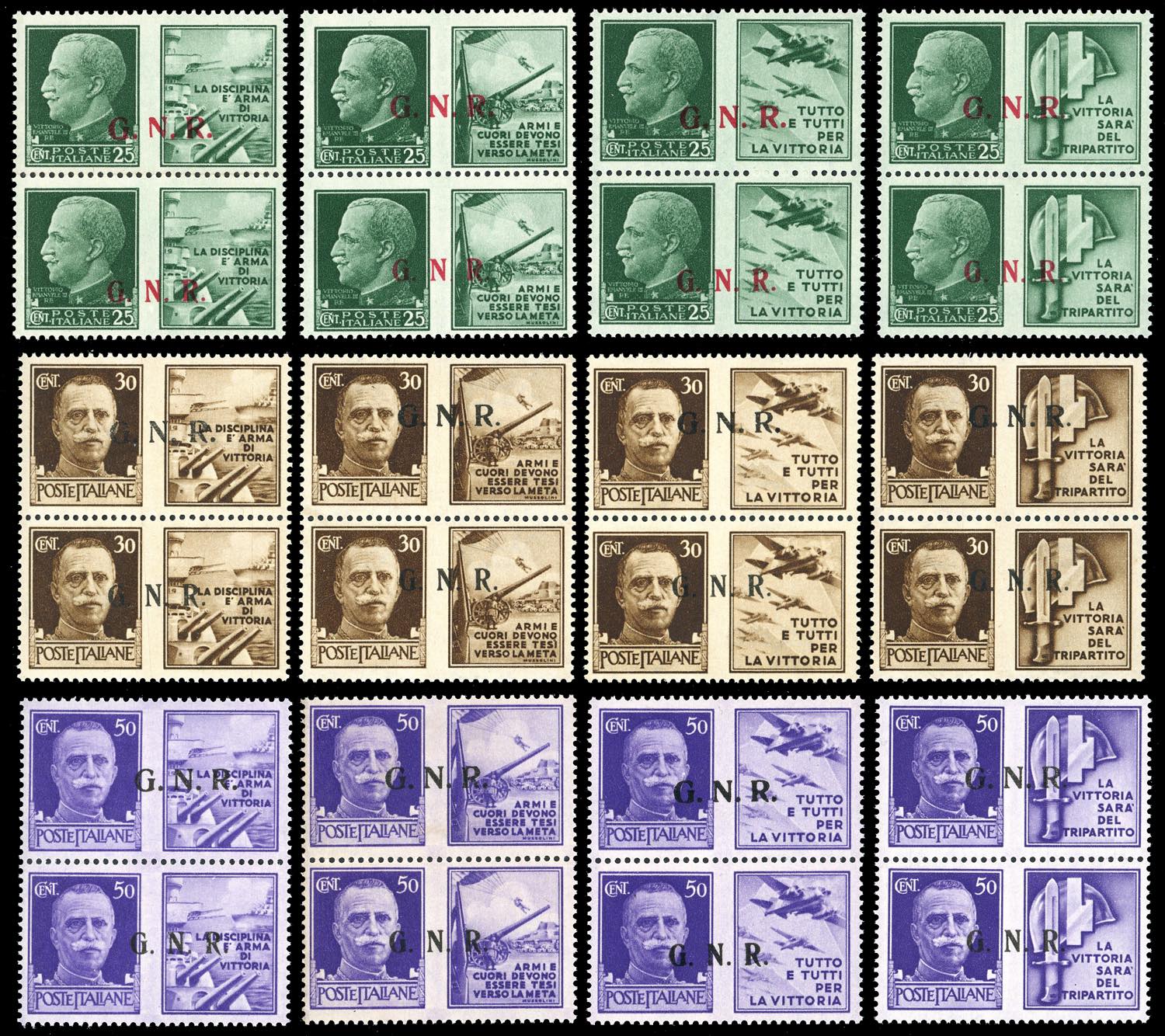 1943 - Soprastampati G.N.R. di Brescia, coppie verticali con soprastampa del II e del III tipo, serie completa (13/II-III-24/II-III), gomma ... Read more