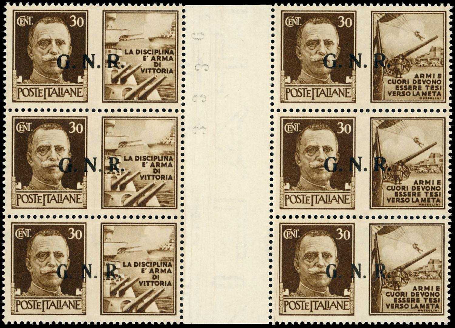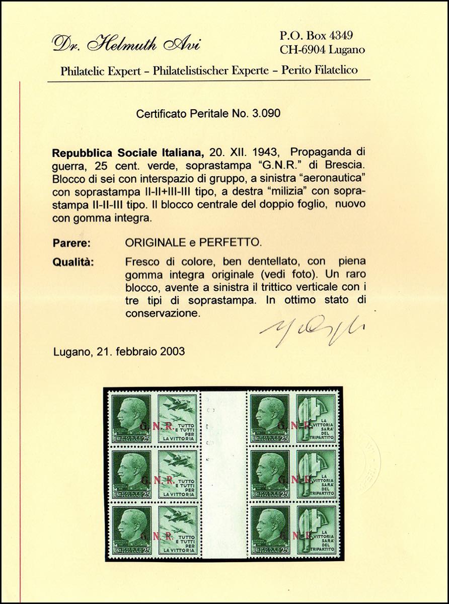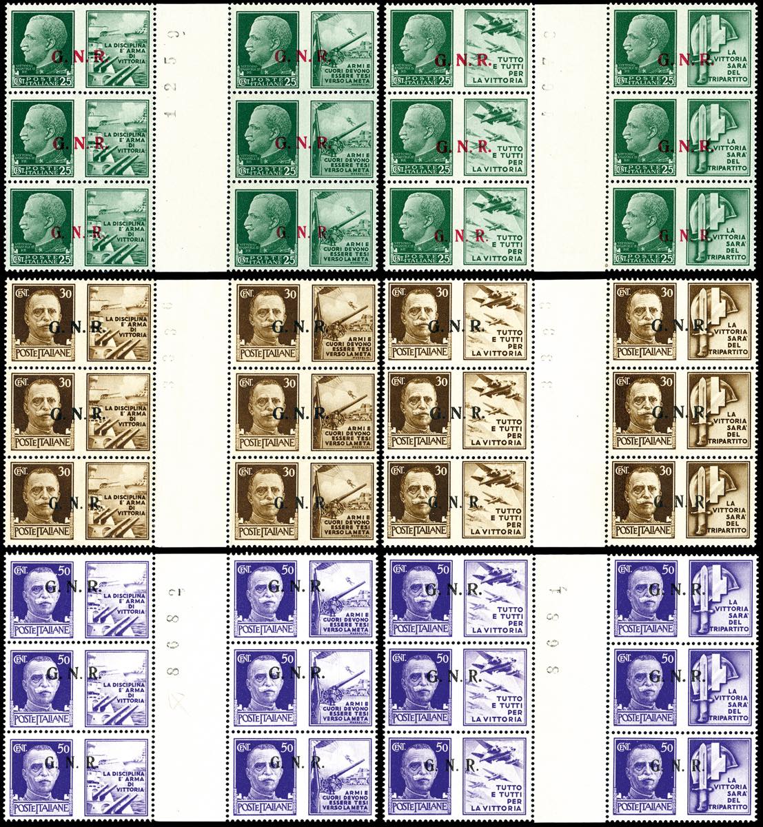 1943 - Eccezionale insieme di tutte le coppie orizzontali con interspazio di gruppo possibili della tiratura di Brescia con soprastampa G.N.R. Si tratta dei dodici valori soprastampati in blocchi di sei esemplari con interspazio di gruppo al centro. La prima coppia orizzontale ha soprastampa del II tipo, la seconda ha sul primo esemplare GN del II tipo e R del III tipo e sul secondo del II tipo, la terza coppia ha soprastampa del III tipo (13/II-24/III,13/III-24/III,13/Iia-24/II), nuovi, gomma originale integra, perfetti. Insieme splendido ed estremamente raro anche per la mancanza delle consuete pieghe verticali nell'interspazio. Ferrario, cert. Avi.