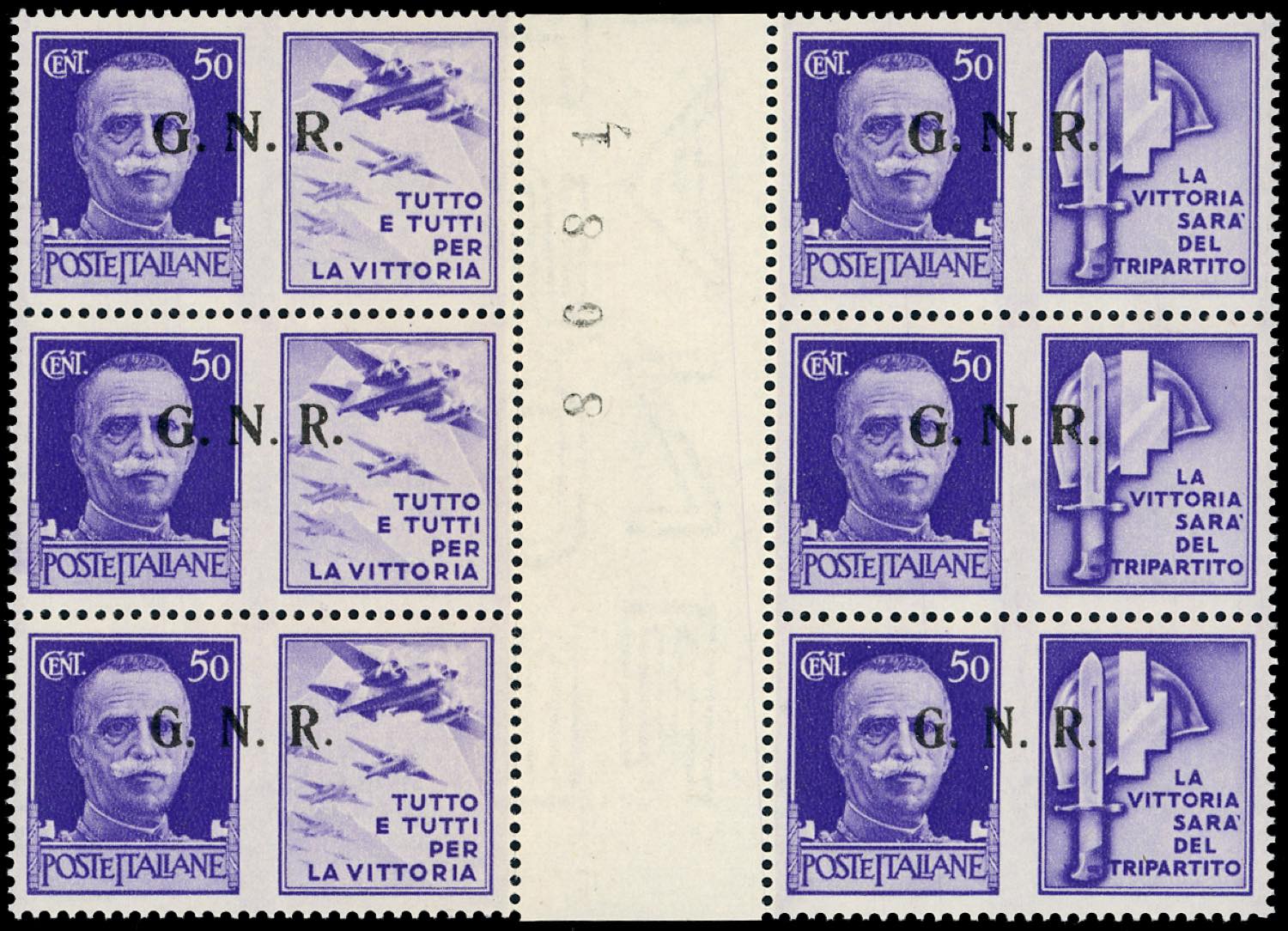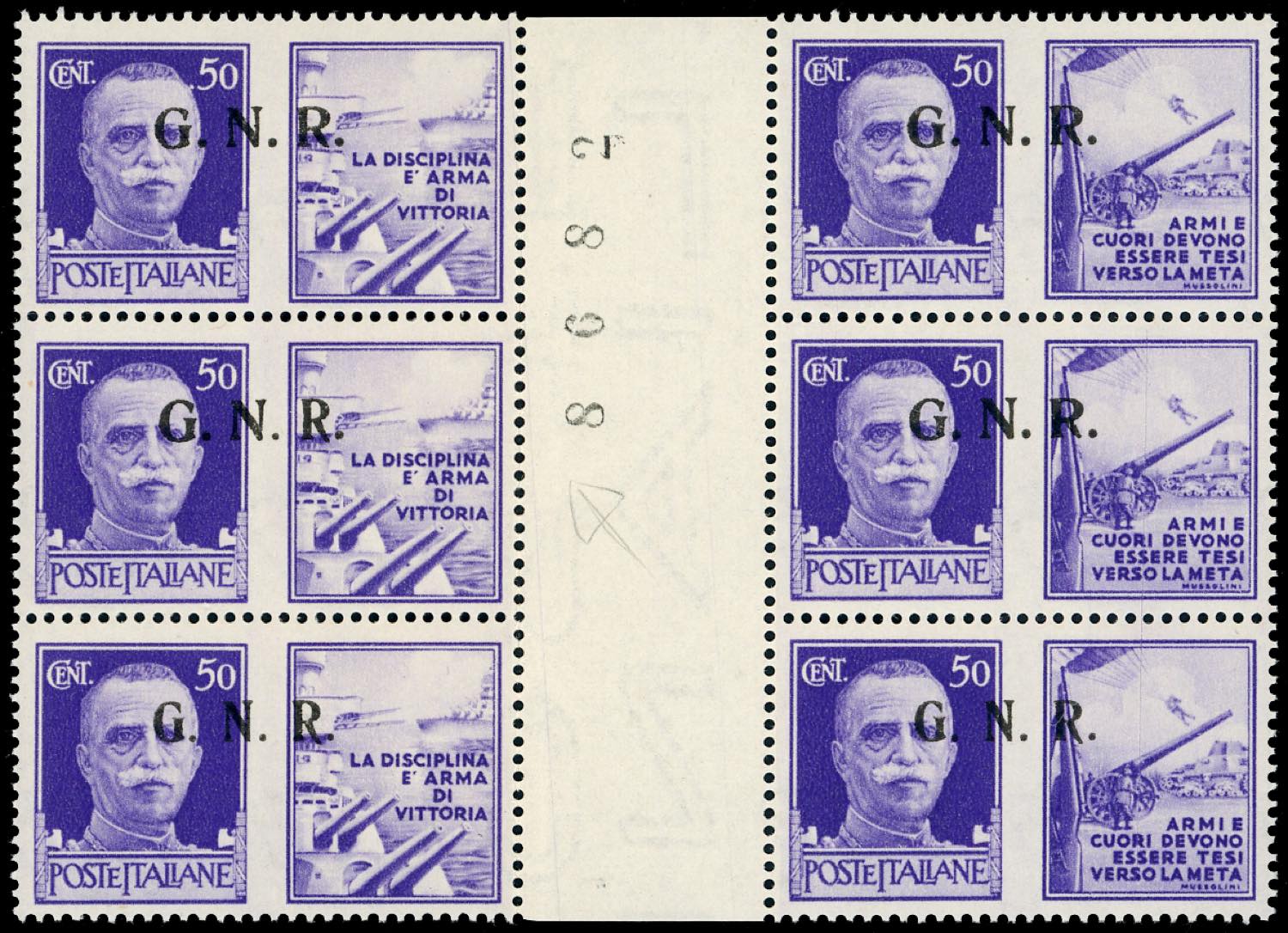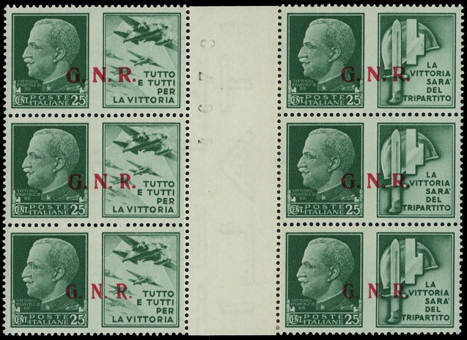 1943 - Eccezionale insieme di tutte le coppie orizzontali con interspazio di gruppo possibili della tiratura di Brescia con soprastampa G.N.R. Si tratta dei dodici valori soprastampati in blocchi di sei esemplari con interspazio di gruppo al centro. La prima coppia orizzontale ha soprastampa del II tipo, la seconda ha sul primo esemplare GN del II tipo e R del III tipo e sul secondo del II tipo, la terza coppia ha soprastampa del III tipo (13/II-24/III,13/III-24/III,13/Iia-24/II), nuovi, gomma originale integra, perfetti. Insieme splendido ed estremamente raro anche per la mancanza delle consuete pieghe verticali nell'interspazio. Ferrario, cert. Avi.