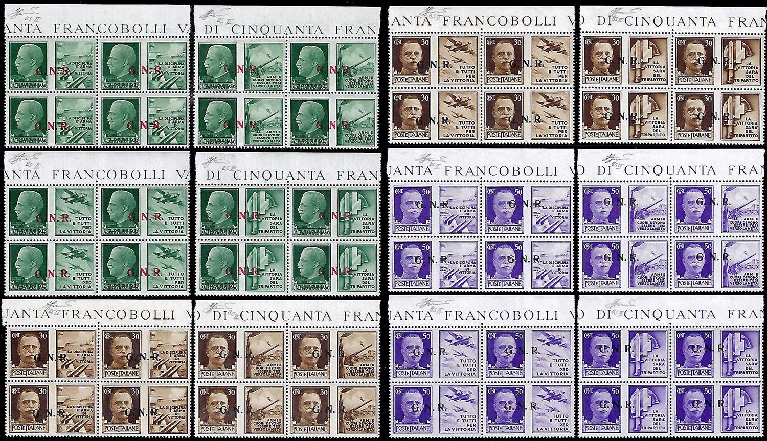 1943 - Serie completa in blocchi di quattro, soprastampa G.N.R. del III tipo di Brescia (13/III-24/III), nuovi, gomma originale integra, ... Read more