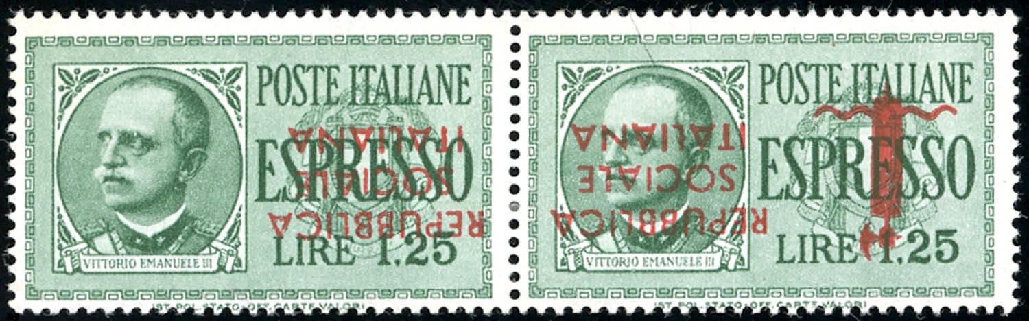 1944 - 1,25 lire, coppia orizzontale con soprastampa capovolta e un esemplare senza fascio in soprastampa (21de), gomma originale, ... Read more