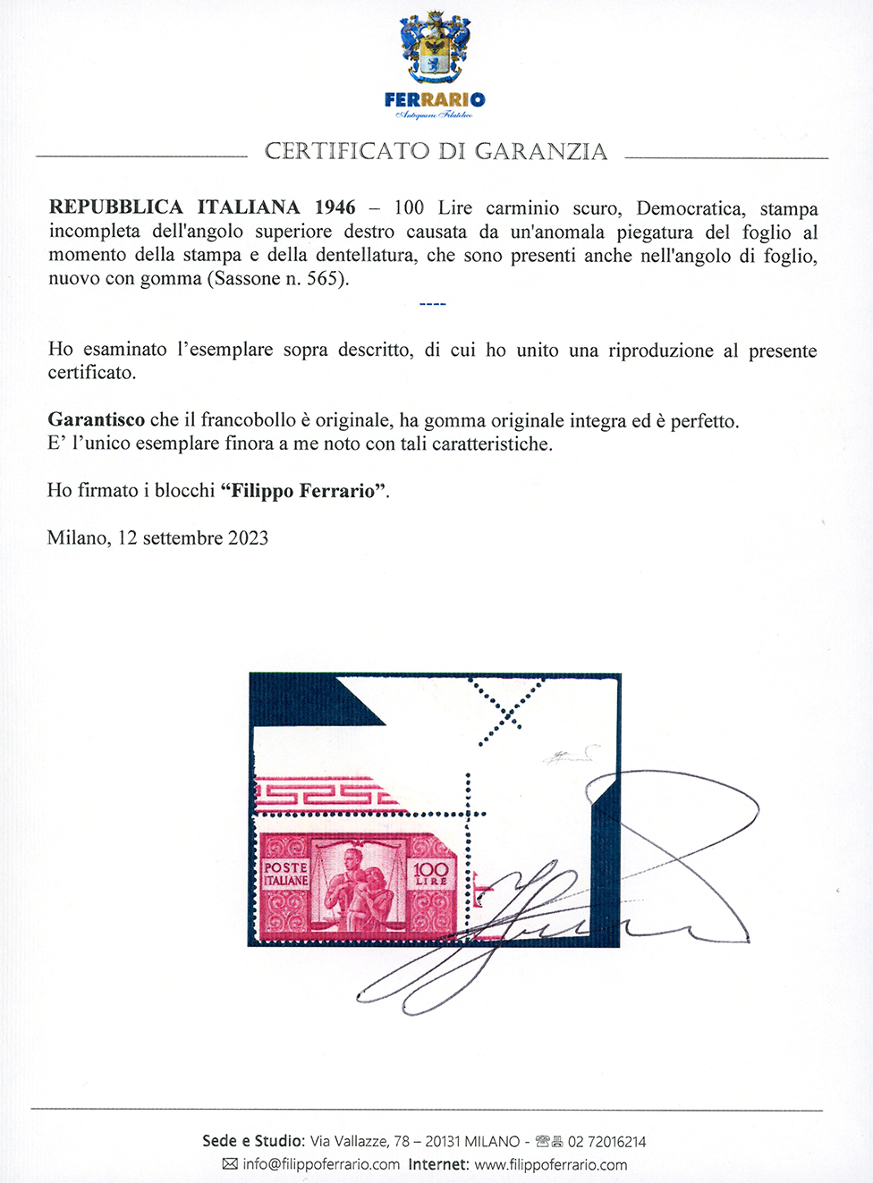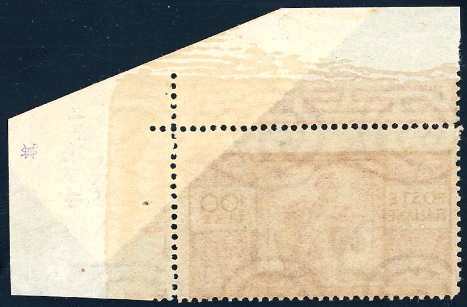 1946 - 100 lire Democratica (565), stampa incompleta dell'angolo superiore destro causata da un'anomala piegatura del foglio al momento della stampa e della dentellatura, che sono presenti anche nell'angolo di foglio, gomma originale integra, perfetto. Splendido ed unico noto. A.Diena, cert. Ferrario.