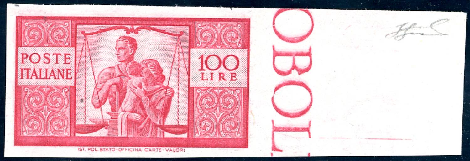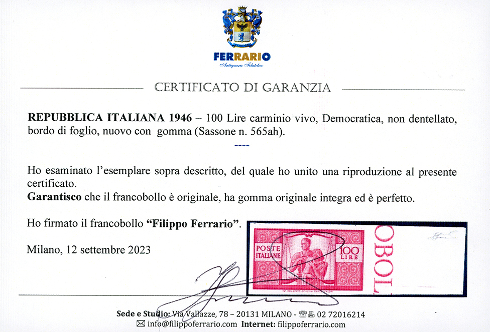 1946 - 100 lire carminio vivo Democratica, non dentellato (565ah), bordo di foglio, gomma originale integra, perfetto. Molto fresco. A.Diena, cert. Ferrario.