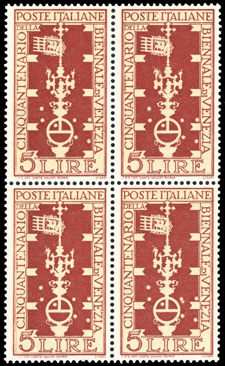 Lot 1381 - 1949 - 5 lire Biennale di Venezia, blocco di quattro ...