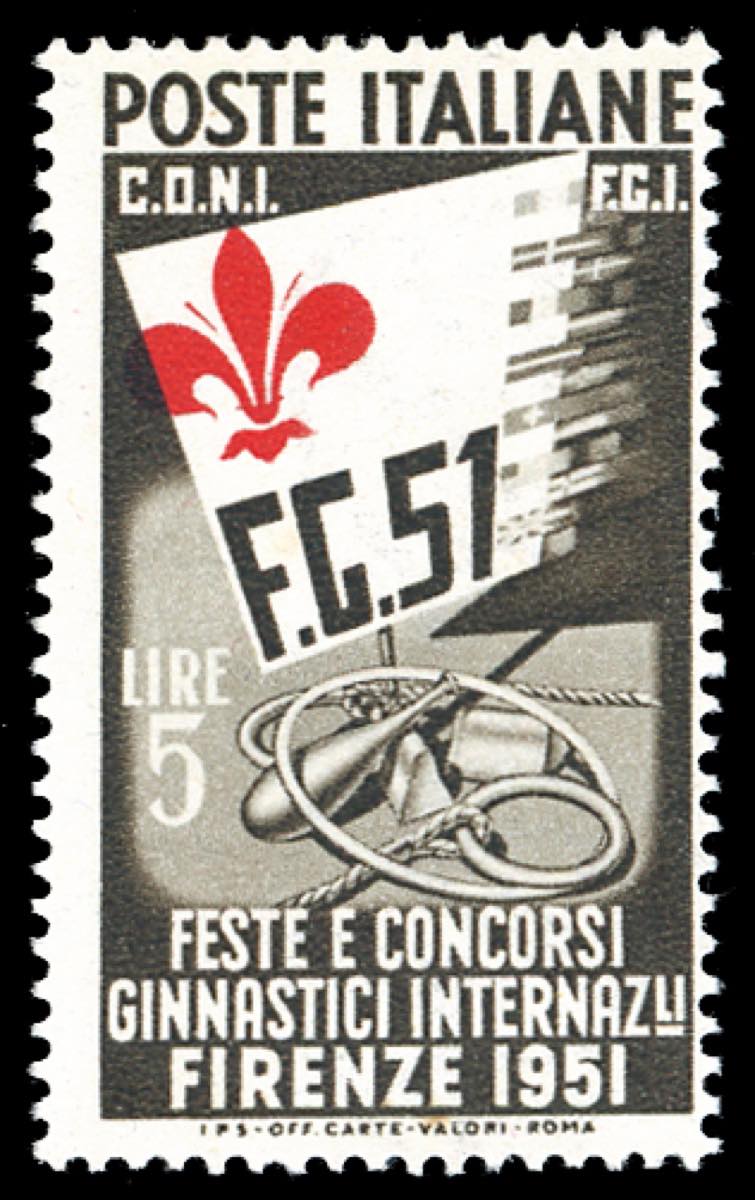 1951 - 5 lire Ginnici, stampa del giglio fortemente sposata a sinistra (661c), gomma originale integra, perfetto. Ferrario.