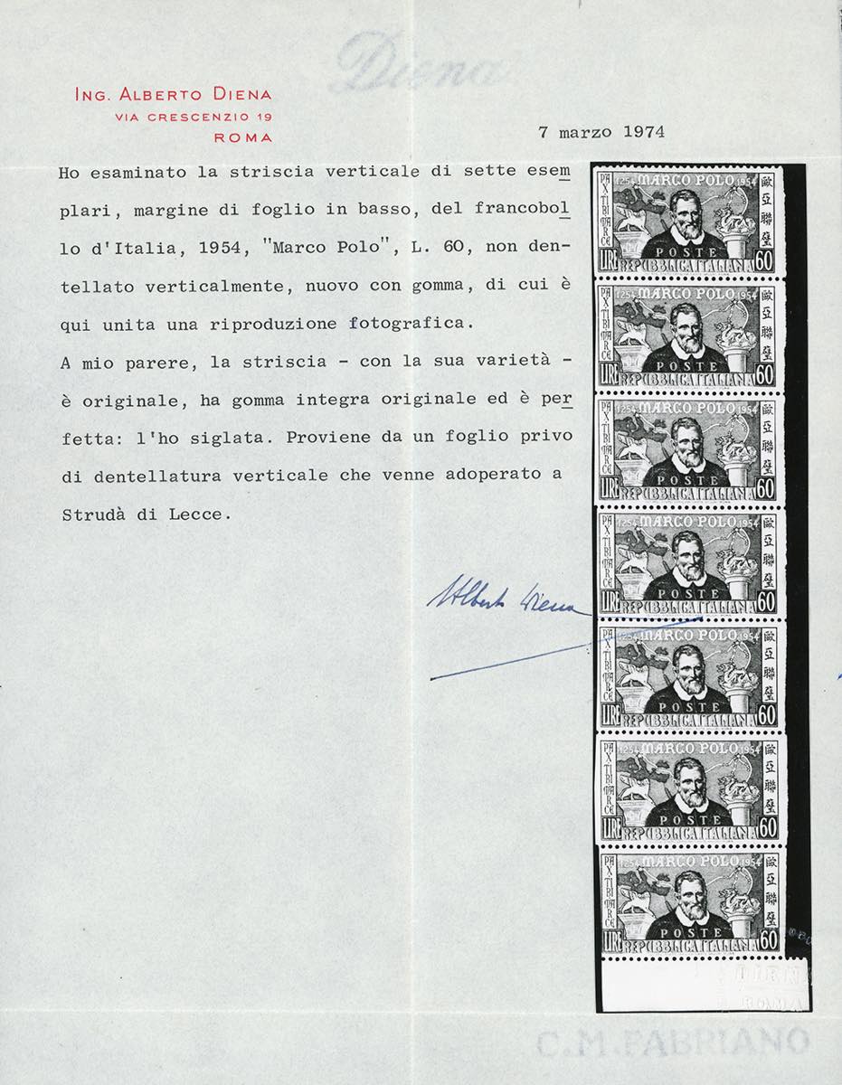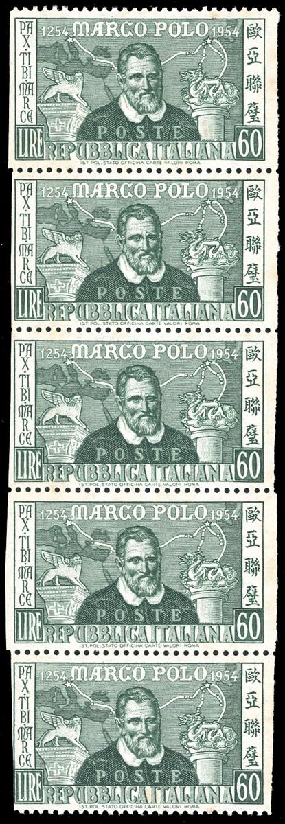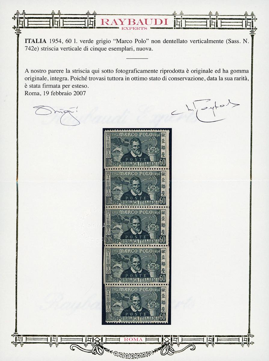 1954 - 60 lire Verdi, non dentellato verticalmente (742e), striscia verticale di 5, gomma originale integra, perfetta. Molto rara. Chiavarello, cert. A.Diena e Oro Raybaudi.