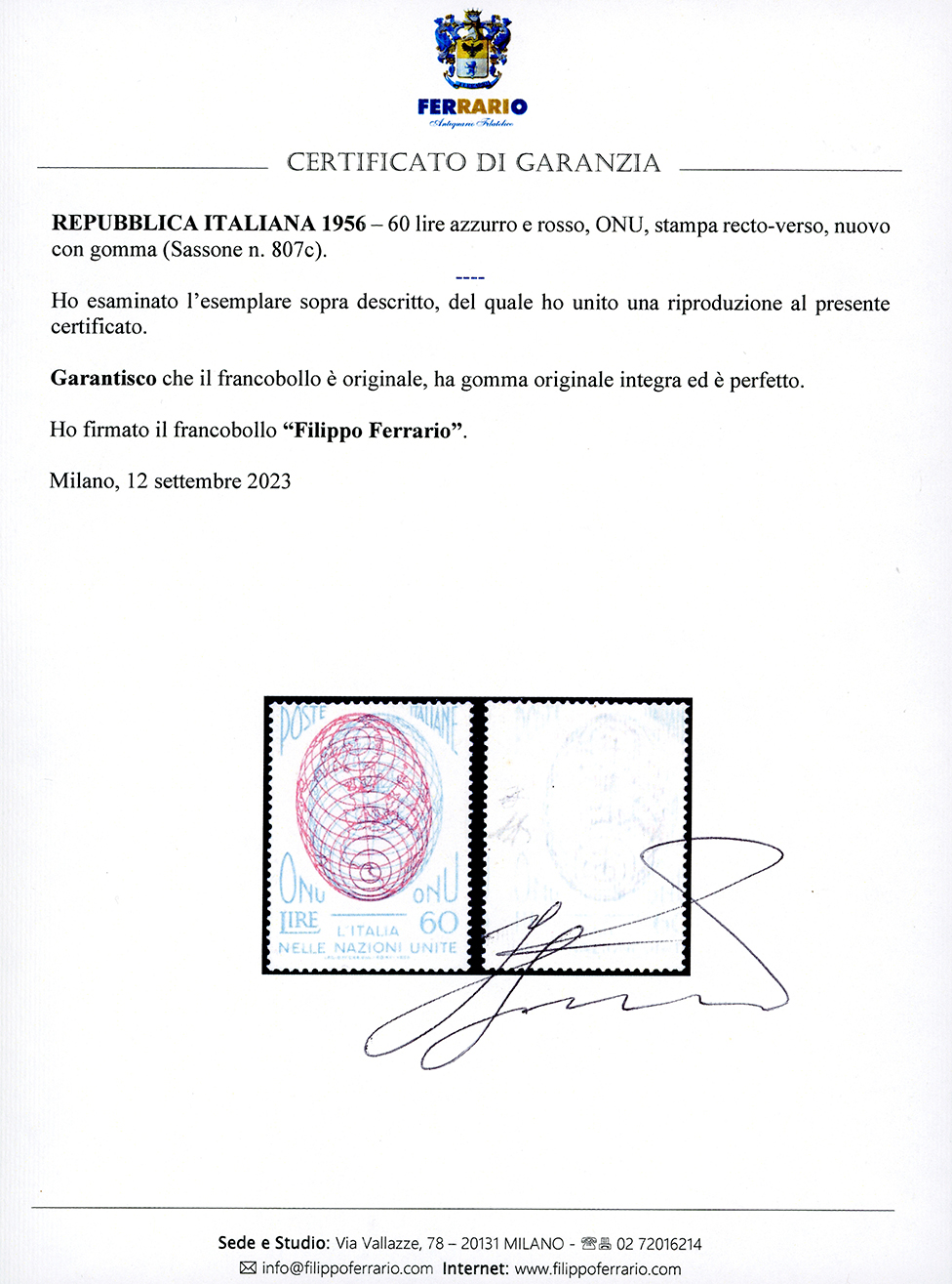 1956 - 60 lire ONU, stampa recto-verso (807c), gomma originale integra, perfetto e di ottima qualità. A.Diena, cert. Ferrario.