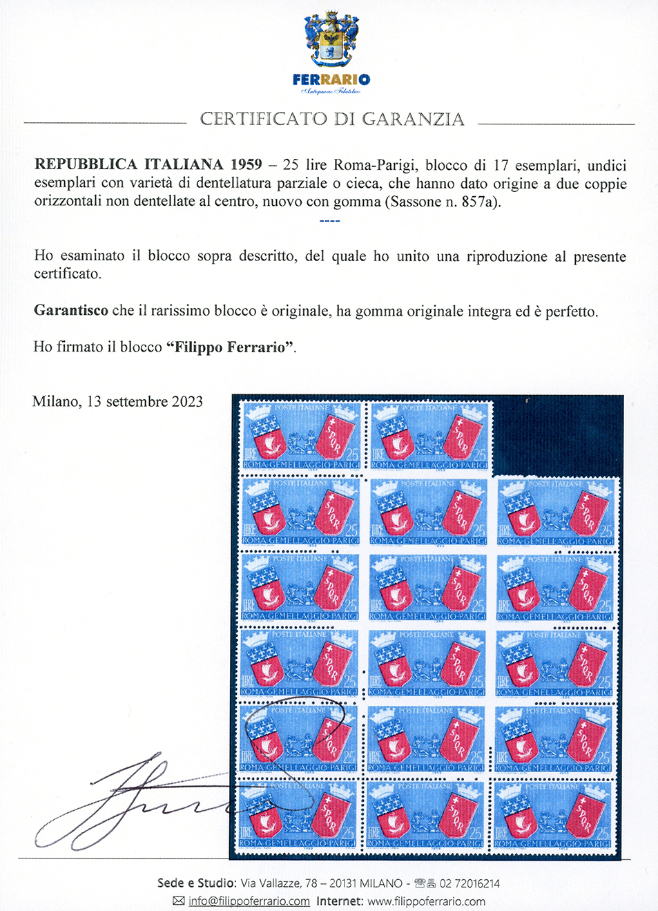 1959 - 25 lire Roma-Parigi, blocco di 17 esemplari, undici esemplari con varietà di dentellatura parziale o cieca, che hanno dato origine a due coppie orizzontali non dentellate al centro (857a), gomma originale integra, perfetto. Molto raro e di ottima qualità. Caffaz e Ferrario.