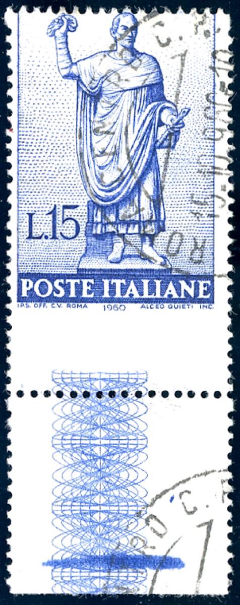 1960 - 15 lire Olimpiadi, dentellatura orizzontale fortemente spostata in basso e senza la dicitura "Giochi XVII Olimpiade" (887f), bordo di foglio in basso, usato, perfetto. Rara varietà. Ferrario.