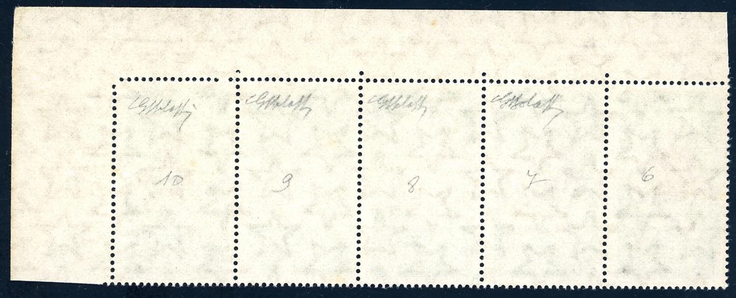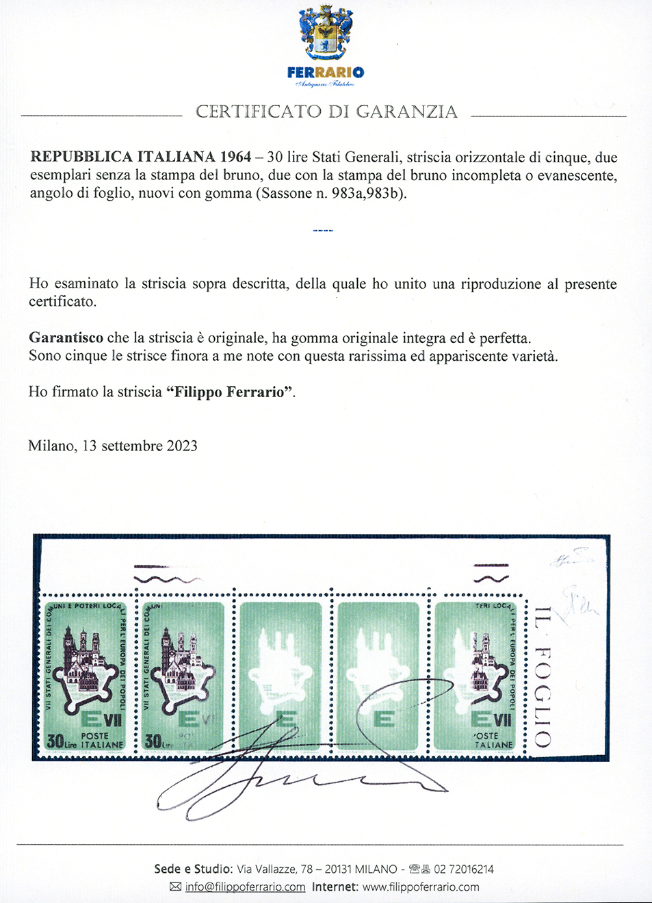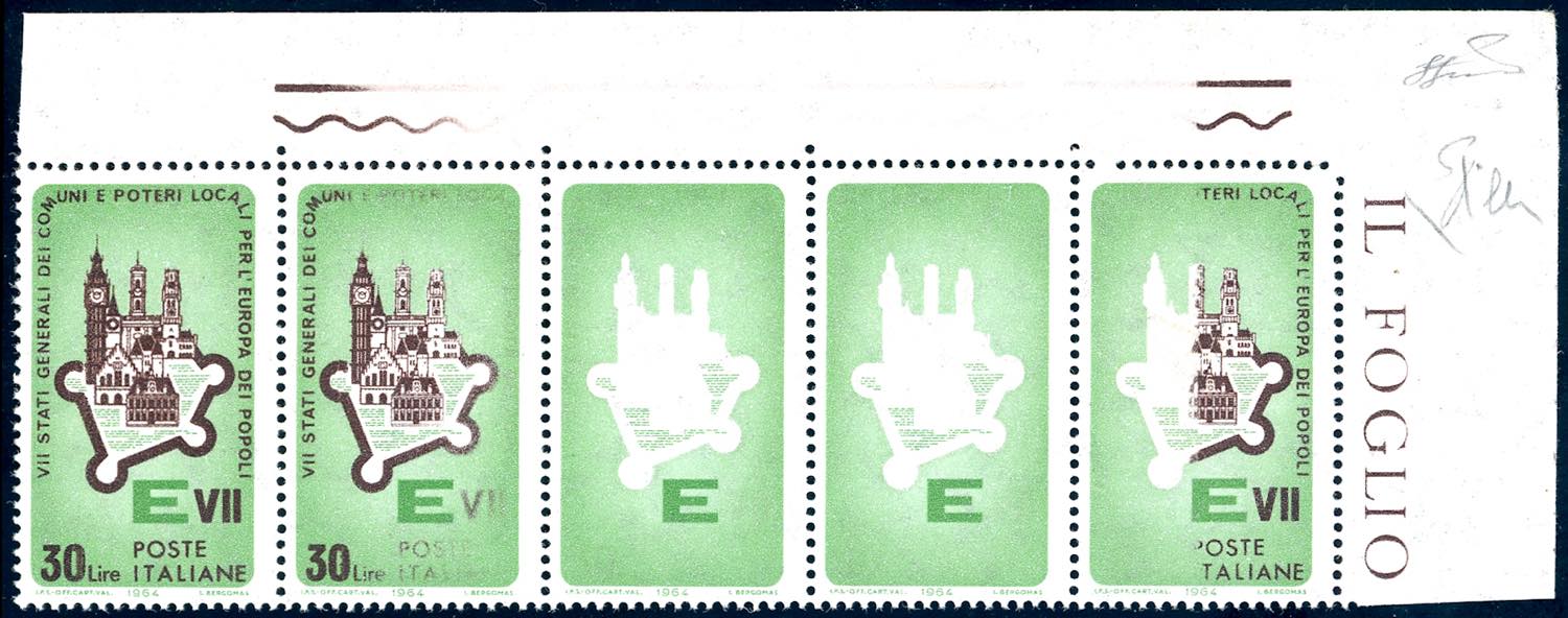 1964 - 30 lire Stati Generali, striscia orizzontale di cinque, due esemplari senza la stampa del bruno, due con la stampa del bruno incompleta o evanescente (983a,983b), angolo di foglio, gomma originale integra, perfetta. Rarissima e spettacolare varietà, solo 5 strisce note. G.Bolaffi, E.Diena, cert. Ferrario.