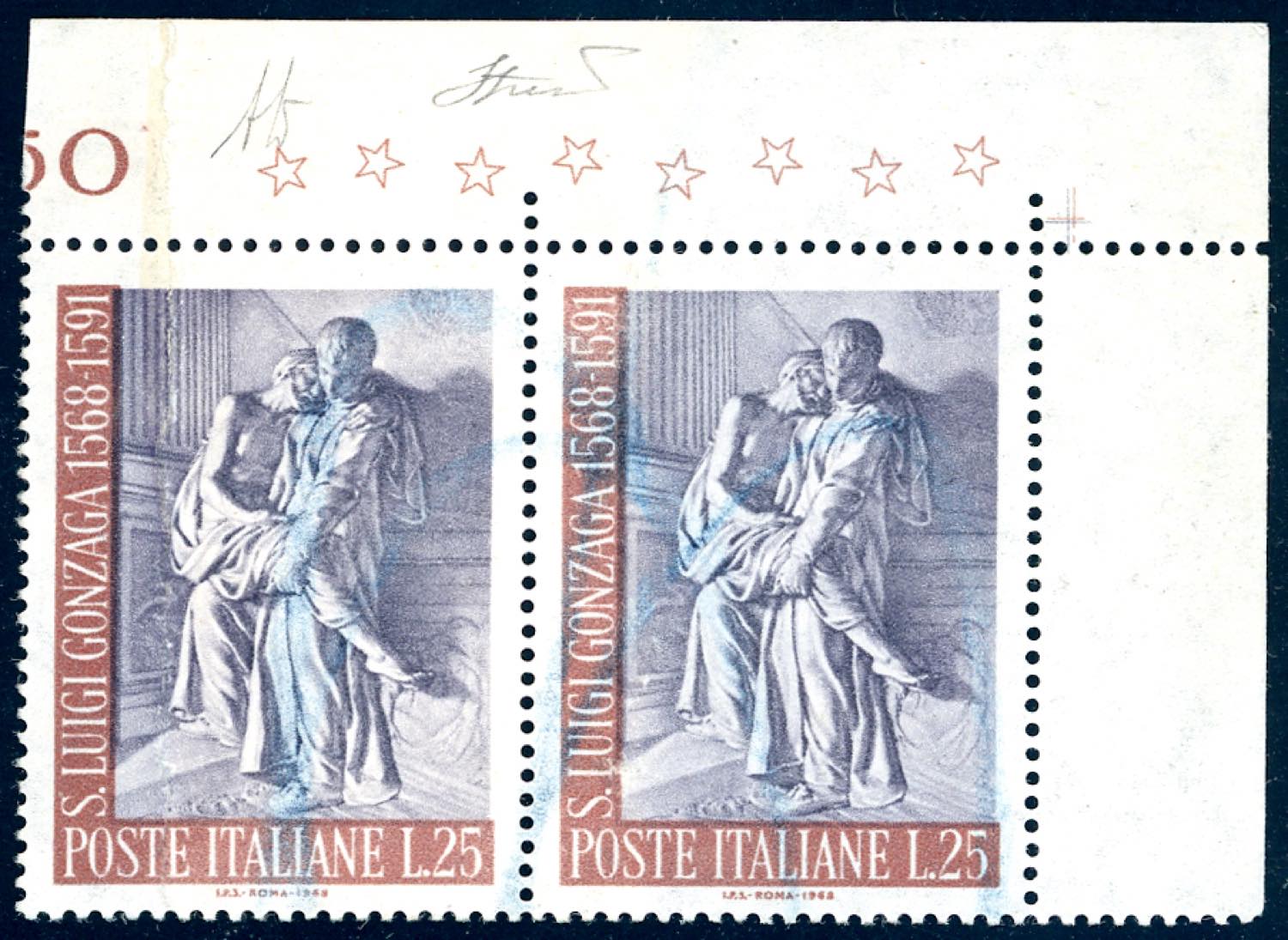 1968 - 25 lire Gonzaga, stampa su carta ricongiunta, coppia orizzontale (1088a), angolo di foglio, gomma originale integra, perfetta, segni di biffatura con matita blu. A.Diena, Ferrario, cert. Carraro.