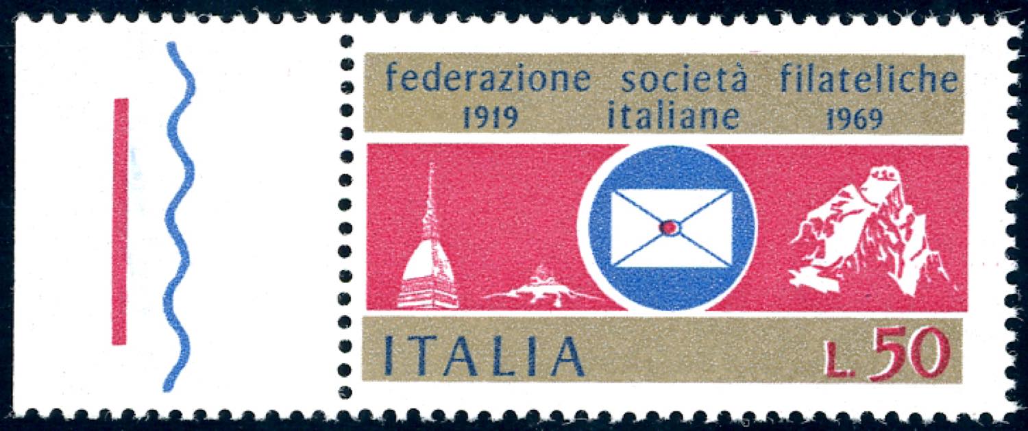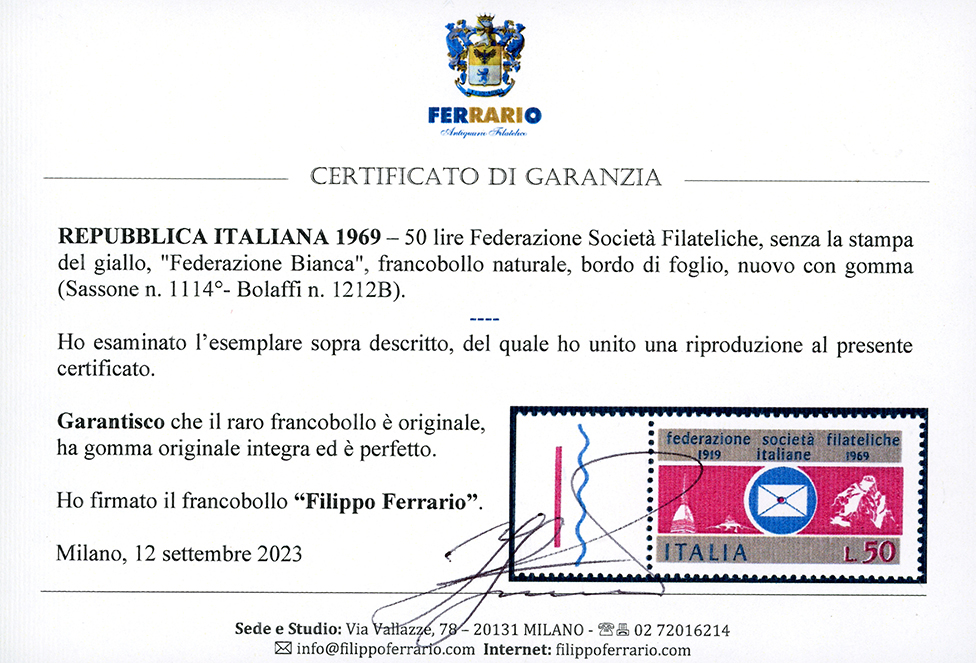 1969 - 50 lire Federazione Società Filateliche, senza la stampa del giallo, "Federazione Bianca", francobollo naturale (1114a,cat.Bolaffi 1212B € 11.000), bordo di foglio, gomma originale integra, perfetto. Molto bello. Cert. Ferrario.