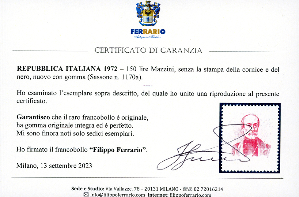 1972 - 150 lire Mazzini, senza la stampa della cornice e del nero (1170a), gomma originale integra, perfetto. Raro, SEDICI ESEMPLARI NOTI, ottima qualità. Carrara, cert. Ferrario.