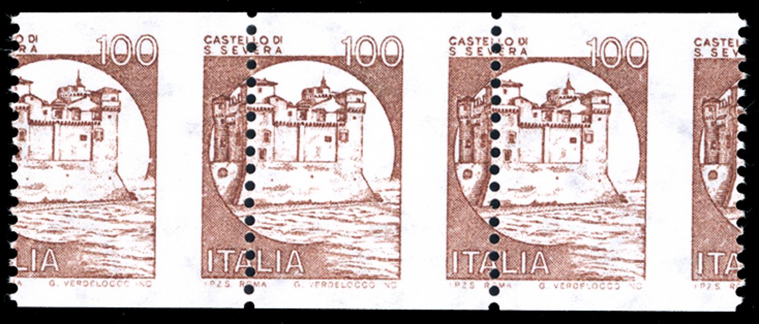 1988 - 100 lire Castelli in bobina (1528B), dentellatura verticale fortemente spostata, striscia orizzontale di tre, gomma originale integra, perfetta. Ferrario.