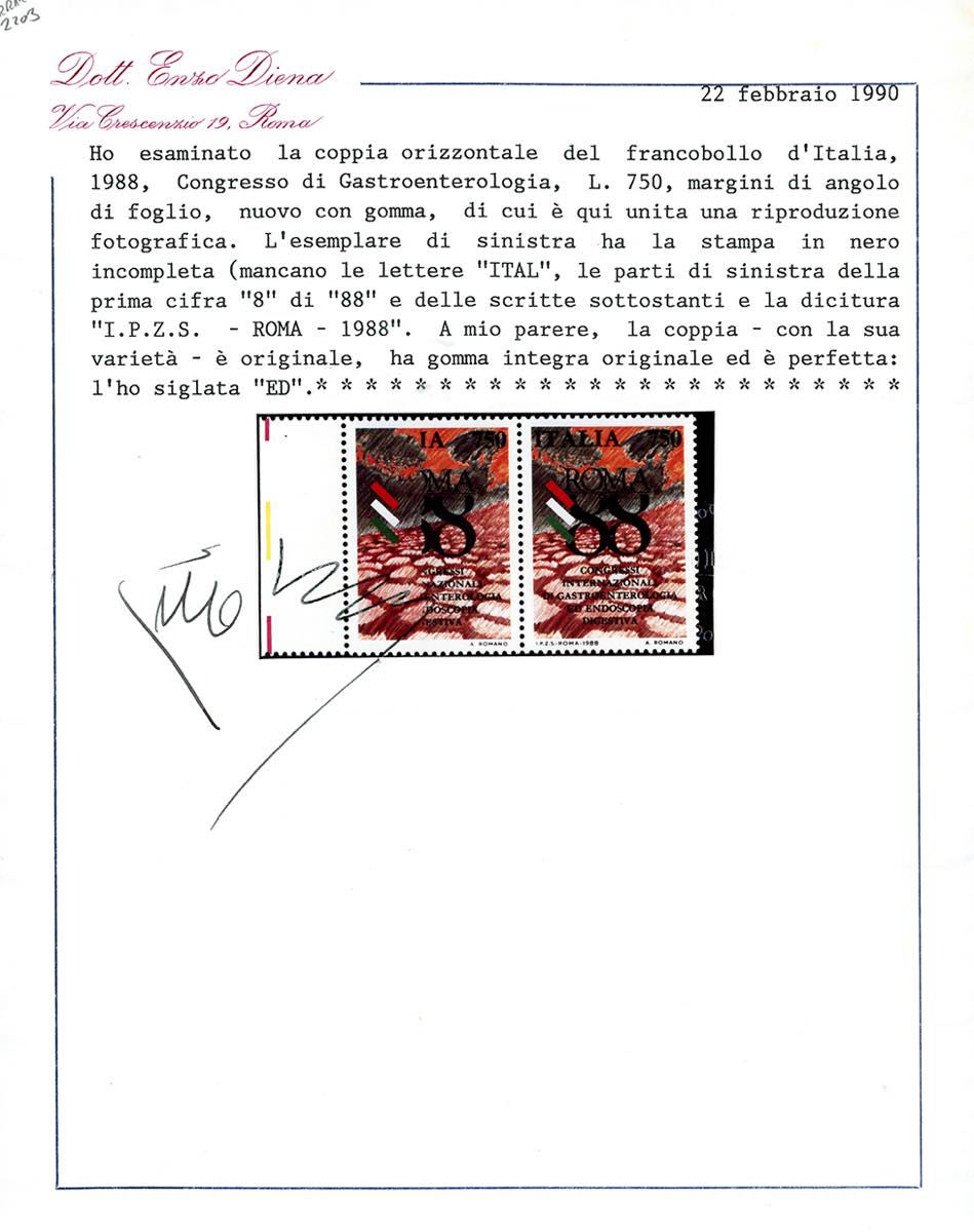 1988 - 750 lire Gastroenterologia, stampa del nero parzialmente mancante, in coppia con il normale (1843a), bordo di foglio , gomma originale integra, perfetta. Molto rara. Cert. E.Diena.