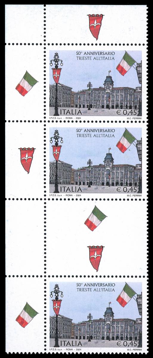 2004 - 0,45 € Trieste (2784), striscia verticale di tre con interspazio di gruppo tra il secondo e il terzo esemplare, non tagliato (proveniente dalla tiratura per il libretto n. 26), angolo di foglio, gomma originale integra, perfetta. Rara e non catalogata. Ferrario.