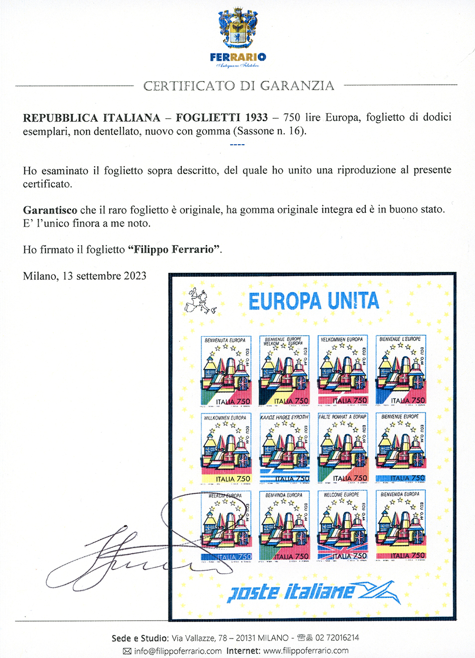 1993 - 750 lire Europa, foglietto (16), non dentellato, gomma originale integra, buono stato, segni di graffette sui bordi. Rarissimo. Cert. Ferrario.