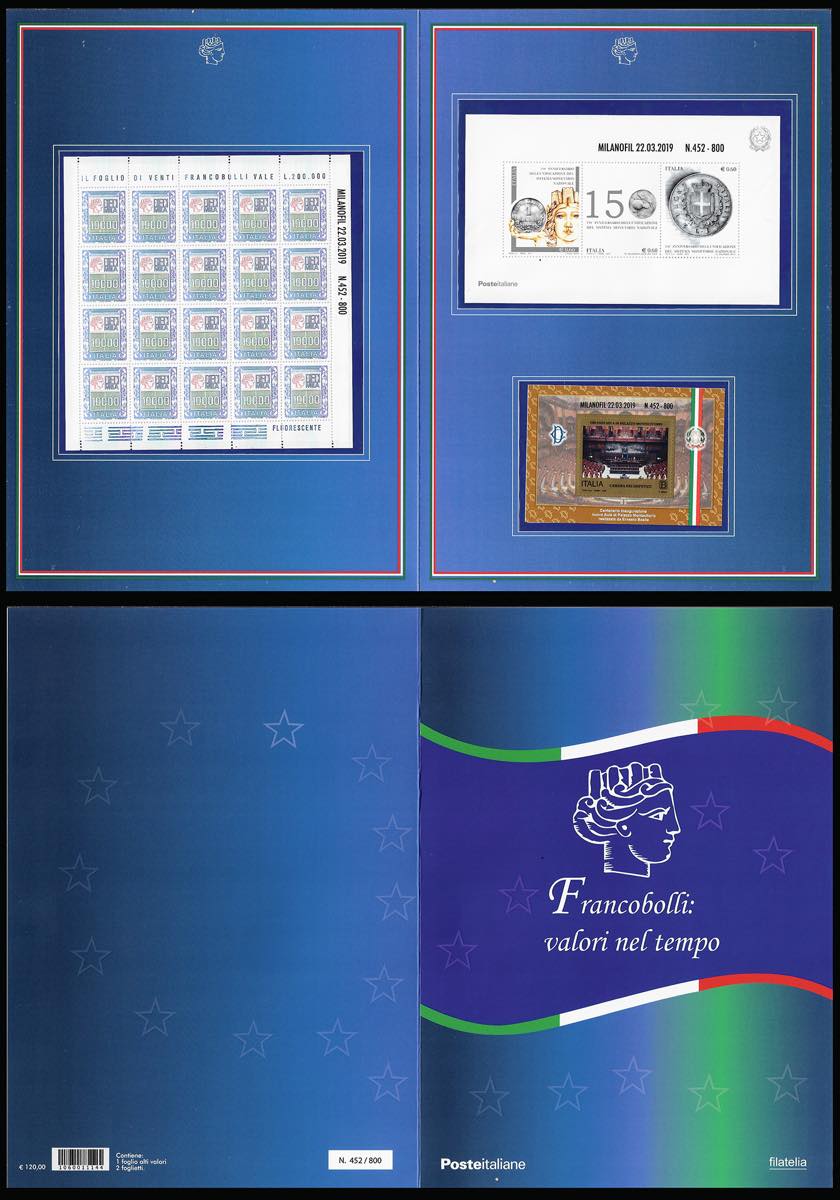 2019 - Folder "Valori nel tempo", comprendente i tre foglietti soprastampati "Milanophil 22.03.2019" numerati (84A, 108A, nota minifoglio n. 1442A), nuovi, perfetti. Molto raro, tiratura 800 esemplari. Cert. Ferrario.