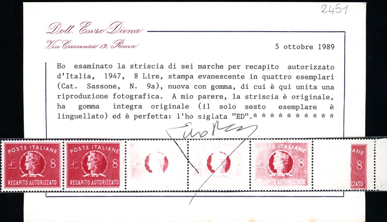 1947 - 8 lire, striscia orizzontale di sei, cinque esemplari con stampa incompleta o evanescente (9a), bordo di foglio, gomma originale integra, impercettibile traccia di linguella sull'ultimo esemplare, perfetta. Splendida e d'effetto. G.Bolaffi, cert. E.Diena.