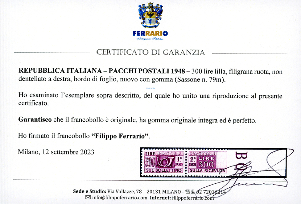 1946 - 300 lire, filigrana ruota, non dentellato a destra (79m), bordo di foglio, gomma originale integra, perfetto e molto bello. Raybaudi, cert. Ferrario.