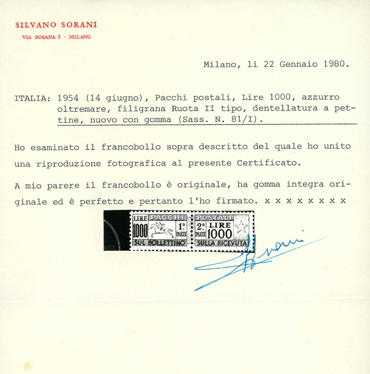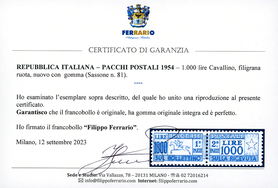 1954 - 1.000 lire Cavallino, filigrana ruota (81), gomma originale integra, perfetto, molto fresco, Cert. Sorani e Ferrario.