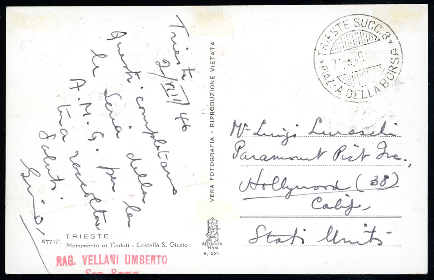 1946 - 5 lire, 10 lire, 20 lire Imperiale, 25 lire e 50 lire Democratica (10,11,12,19,20), perfetti, su cartolina da Trieste 2/8/1946 per gli Stati Uniti.