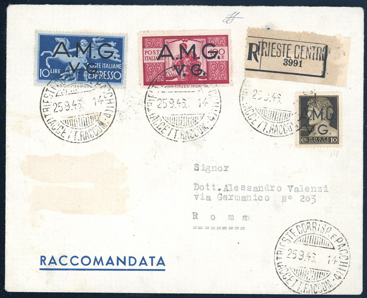 1946 - 100 lire Democratica, 10 cent. Imperiale, 10 lire espressi (21,2,E1), perfetti, su busta raccomandata da Trieste 25/9/1946 a Roma. ... Read more