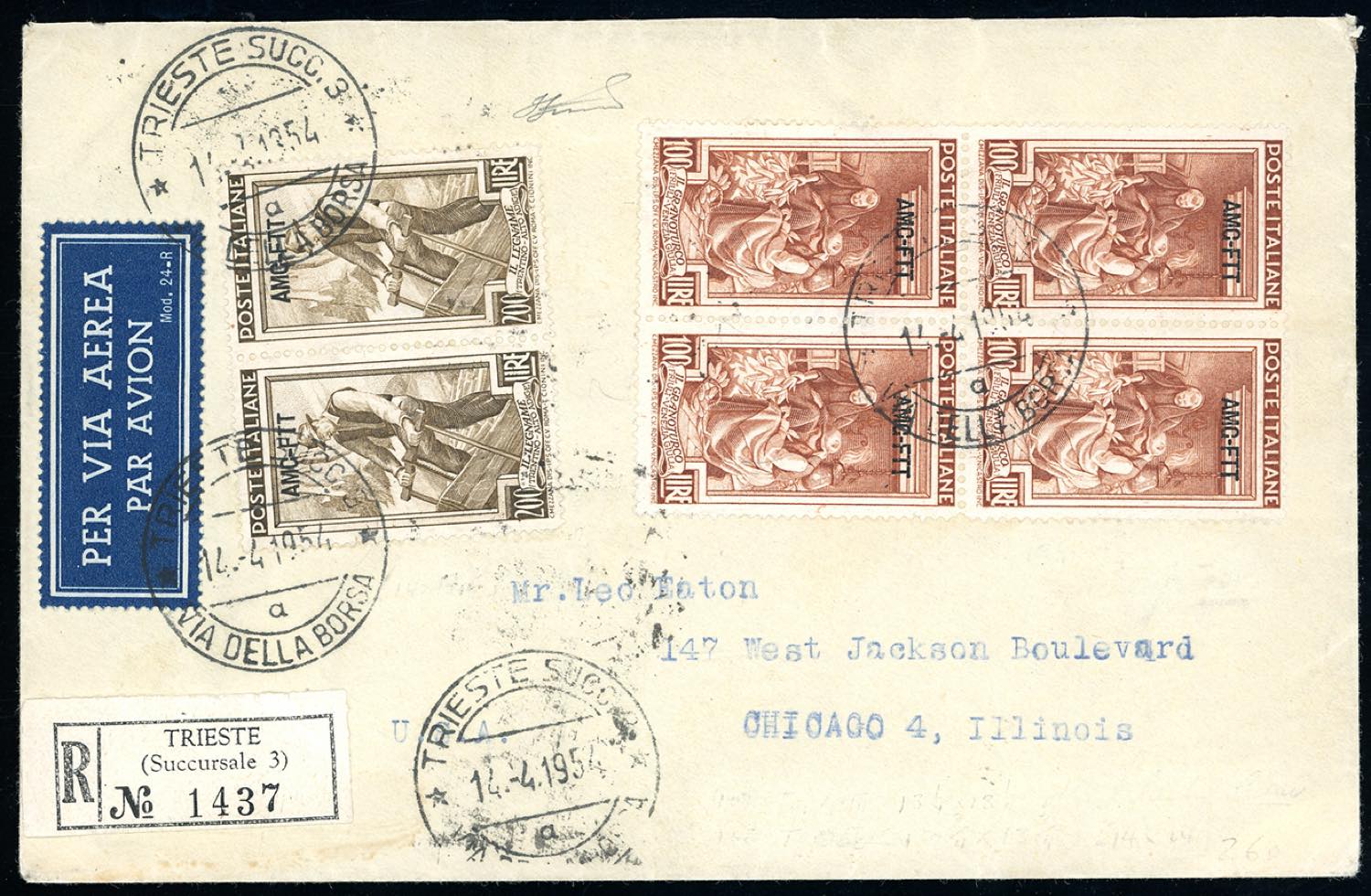 1954 - 100 lire, blocco di quattro e 200 lire, coppia, Lavoro (106/107), perfetti, su aerogramma raccomandato da Trieste 14/4/1954 per gli Stati Uniti, bolli d'arrivo. Rara affrancatura. Ferrario.