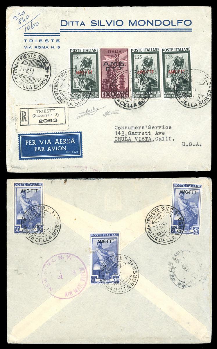 POSTA AEREA 1951 - 1.000 lire Campidoglio, soprastampa su due righe, 25 lire Ciclismo tre esemplari, e, al verso, 50 lire Lavoro tre esemplari (A16,127,89), perfetti, su aerogramma raccomandato da Trieste 23/8/1951 per gli Stati Uniti. Rara e di ottima qualità. Raybaudi, Ferrario.