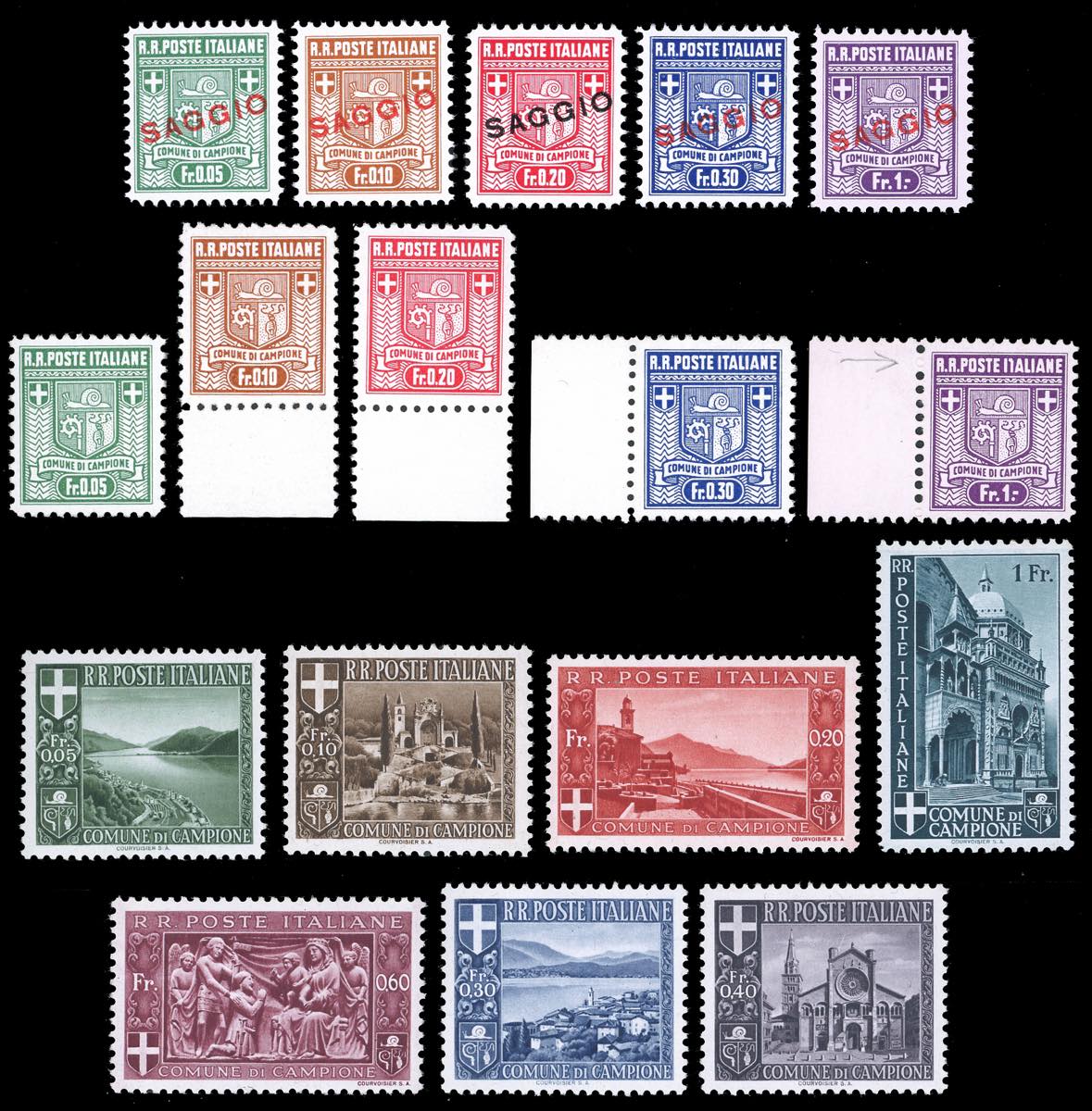 CAMPIONE 1944 - Stemma, dent. 11 1/2, I tiratura, soprastampati "saggio", serie completa (1a/5a nota), gomma originale integra, perfetti e molto freschi. Avi. Unite anche le due serie tipo (1/5,6/12), entrambe gomma originale.