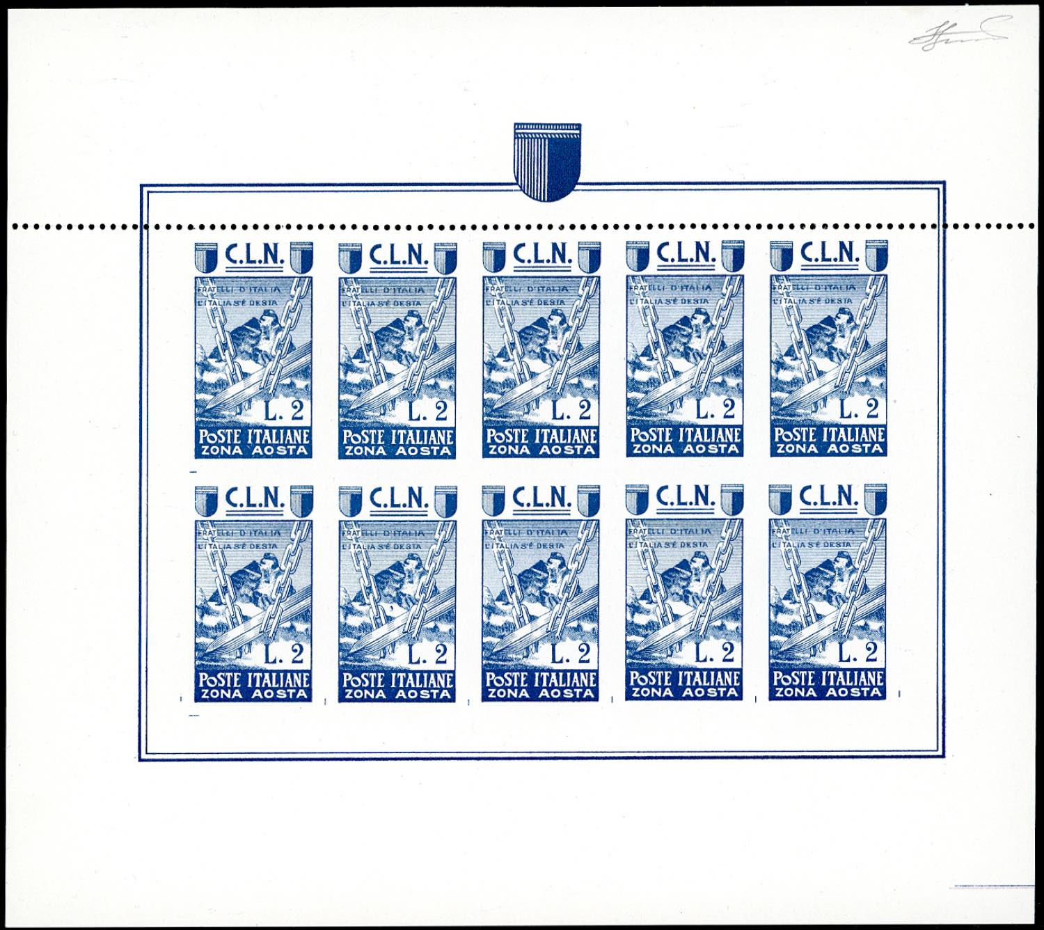 Lot 1581 - AOSTA 1945 - 2 lire azzurro grigio, foglietto di dieci ...