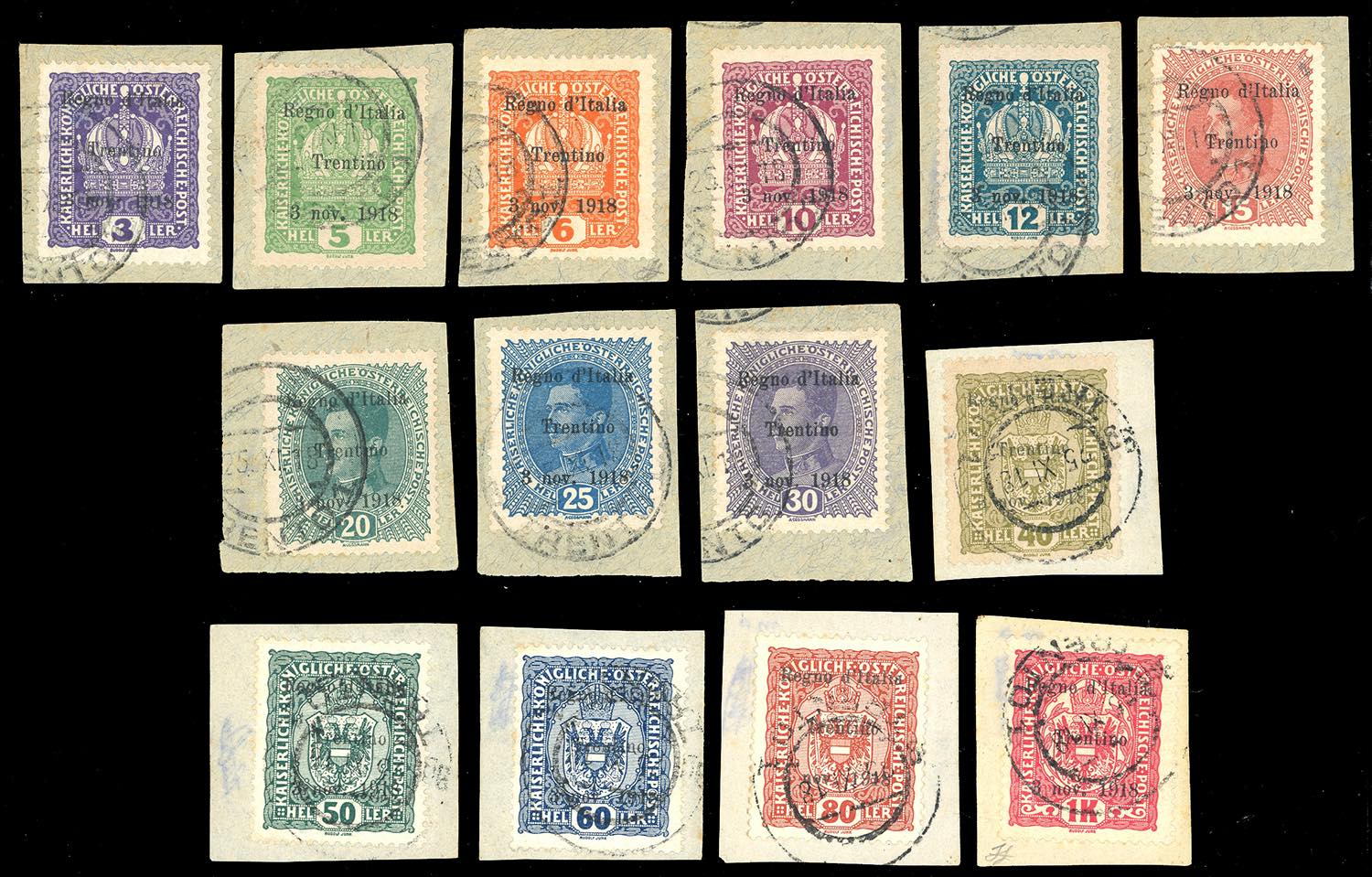 TRENTINO ALTO ADIGE 1918 - Soprastampati, serietta di 14 valori (1/13,15), perfetti, usati su frammento. Ferrario.