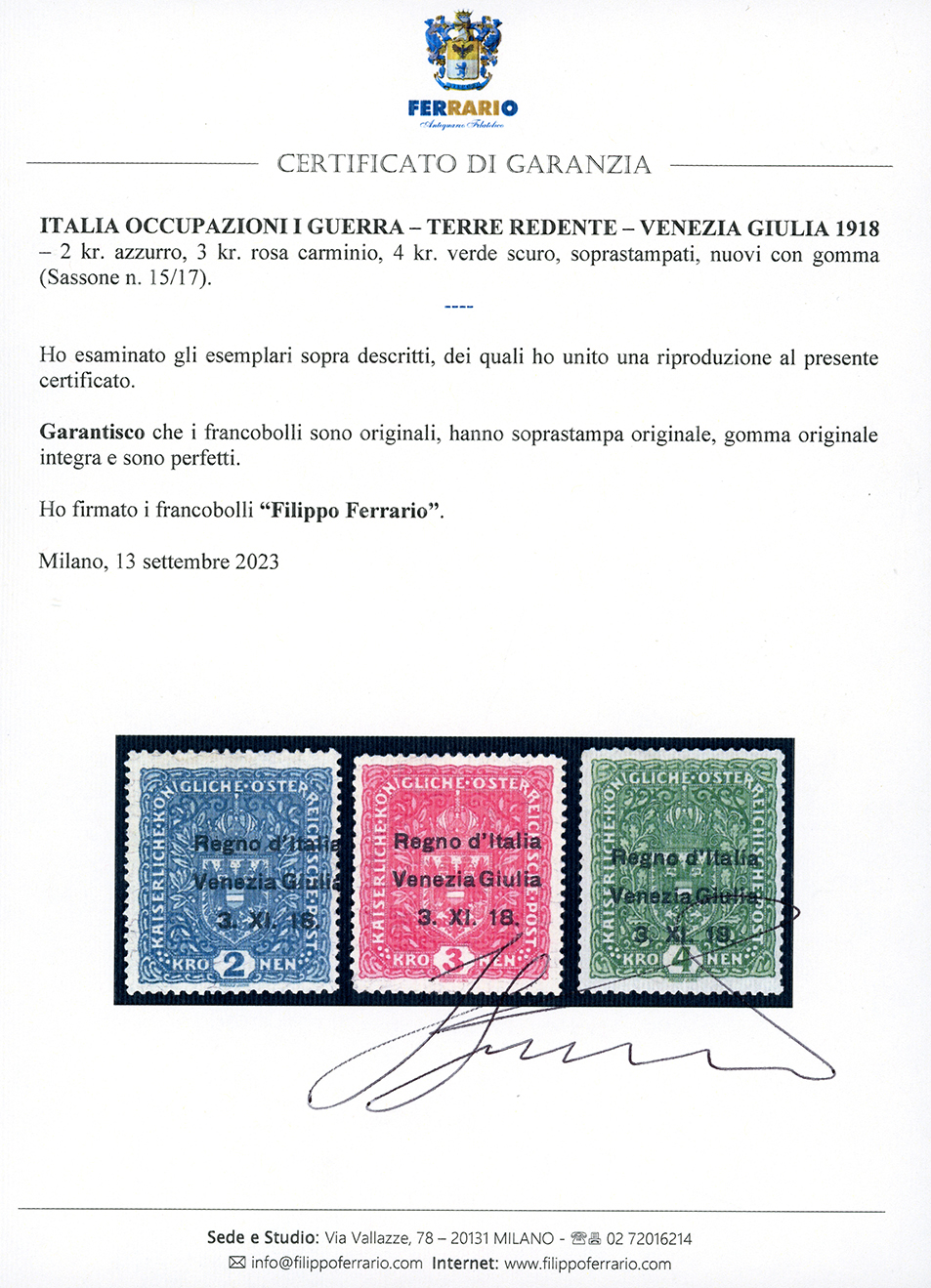 VENEZIA GIULIA 1918 - 2 k., 3 k. e 4 k. soprastampati (15/17), gomma originale integra, perfetti. Molto freschi. Cert. Diena e Ferrario.