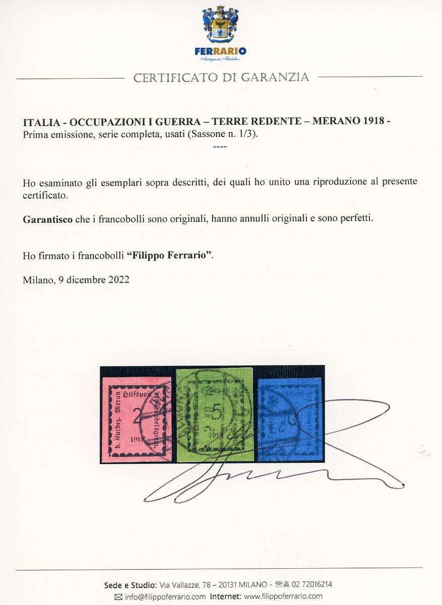 MERANO 1918 - I emissione, serie completa (1/3), usati, perfetti. Cert. Ferrario.