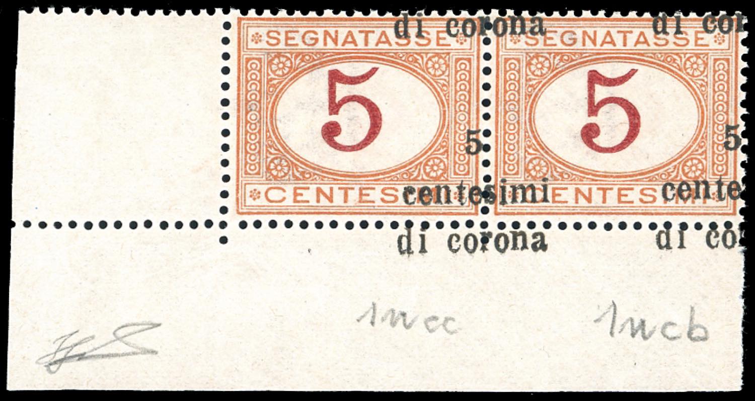 TRENTO E TRIESTE SEGNATASSE 1919 - 5 cent. su 5 cent., coppia orizzontale con soprastampa fortemente spostata in basso e a destra, ... Read more